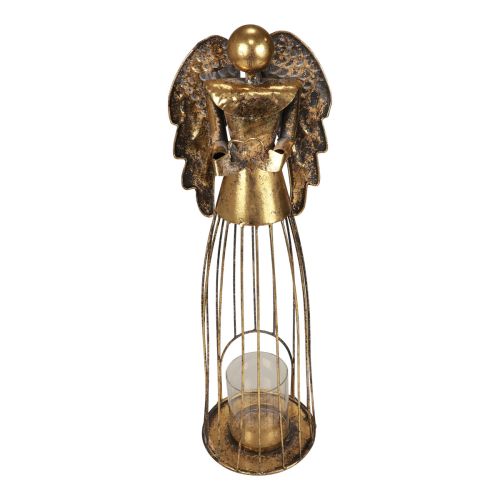 La figurine d'ange de Noël est de couleur dorée et partiellement finie avec de la peinture noire dans un look antique tendance. À l'intérieur de la grande décoration d'ange se trouve un photophore dans lequel peut être insérée une bougie chauffe-plat ou une bougie pilier d'un diamètre allant jusqu'à 7 centimètres et d'une hauteur de 10 centimètres.