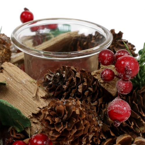 L'arrangement de bougies avec des cônes aux couleurs naturelles est composé de matériaux naturels tels que des cônes et du bois, mais également de plastique et de verre. Sa hauteur est d'environ 8 centimètres sans une bougie. Dans l'ensemble, son diamètre est d'environ 19 centimètres. Le diamètre intérieur du porte-bougie est d'environ 3,5 cm; il convient donc aux bougies d'un diamètre de 35 millimètres.