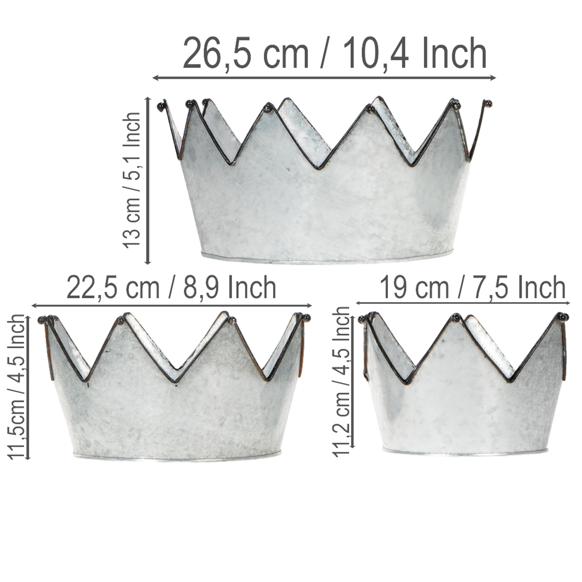 Les trois bols en métal en zinc sont fabriqués en différentes tailles. Leur point commun est la bordure noire autour des pointes, qui sont décorées d'une petite boule ornementale. La boule est également noire pour correspondre à la décoration vintage. La bordure noire avec décoration le rend clair pour tout le monde : il y a trois couronnes ici - prêtes à être remplies ou simplement à être placées.
