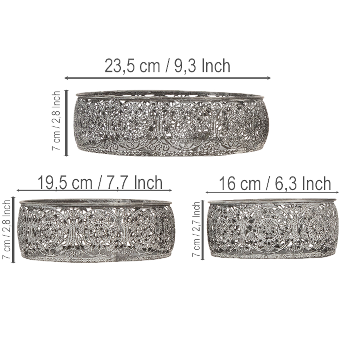 Les trois bols ronds de diamètres différents peuvent être utilisés de différentes manières pour vos idées de décoration. Le gris argenté associé au lavis blanc se marie à merveille avec des pierres décoratives claires ou grises sur lesquelles pourraient se poser des bougies de couleur blanche ou anthracite. Vous pouvez également utiliser les trois bols décoratifs comme rangement décoratif pour vos petits trésors.