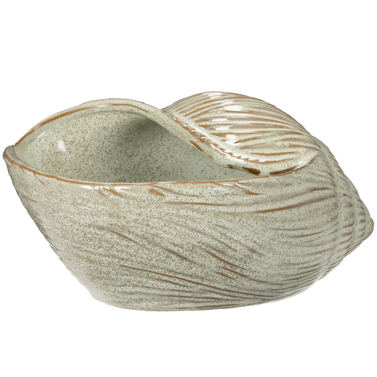 La forme unique de ce bol en céramique évoque les douces courbes d'un coquillage. Le subtil jeu de nuances de vert et de beige-brun lui confère une beauté intemporelle. Son design invite à la flânerie sur la plage et apporte une atmosphère paisible et naturelle à toute pièce. Ce bol est idéal pour ranger élégamment ses clés dans l'entrée, exposer de petits bijoux sur une coiffeuse, ou même servir de cache-pot pour y introduire de petites plantes grasses et ajouter une touche de raffinement.