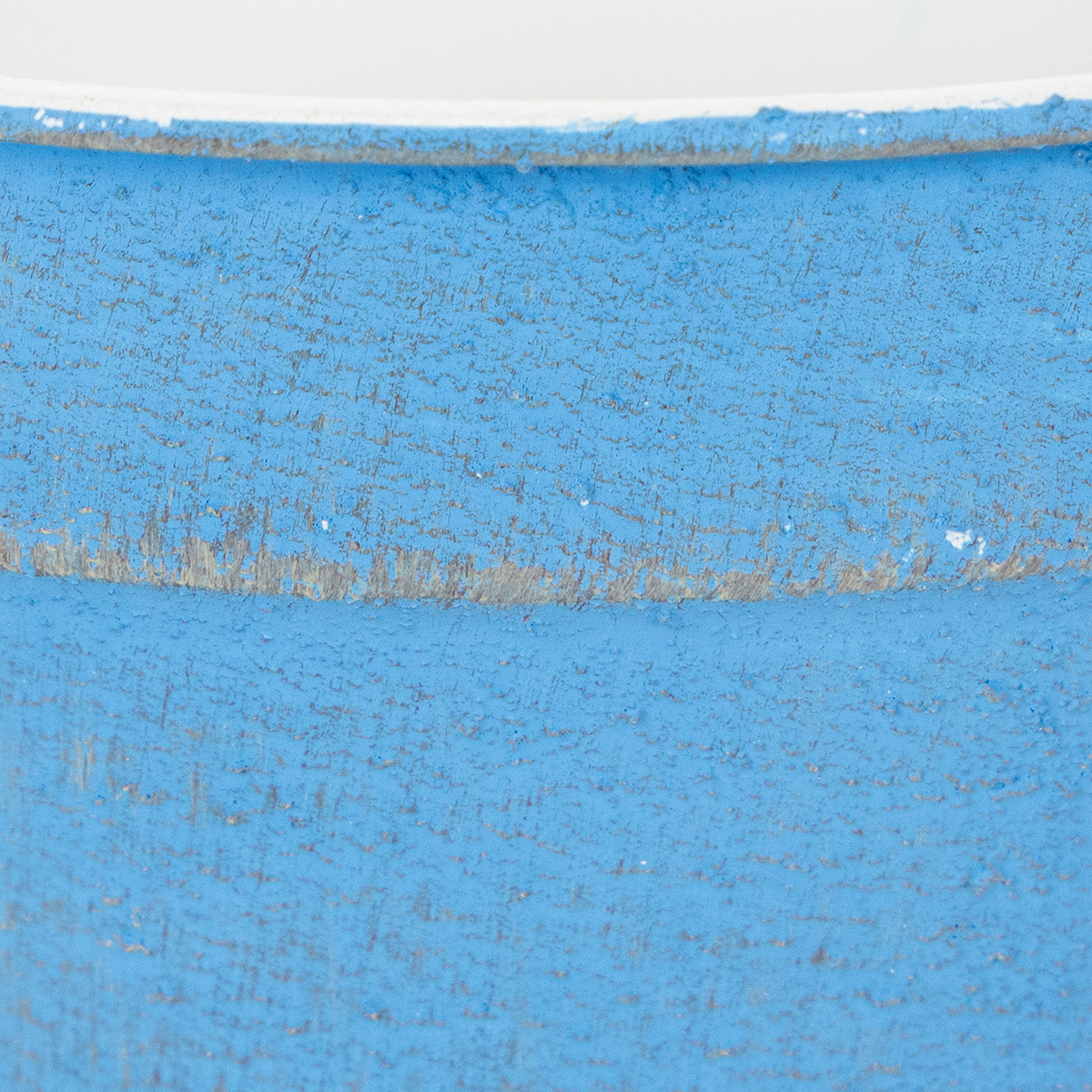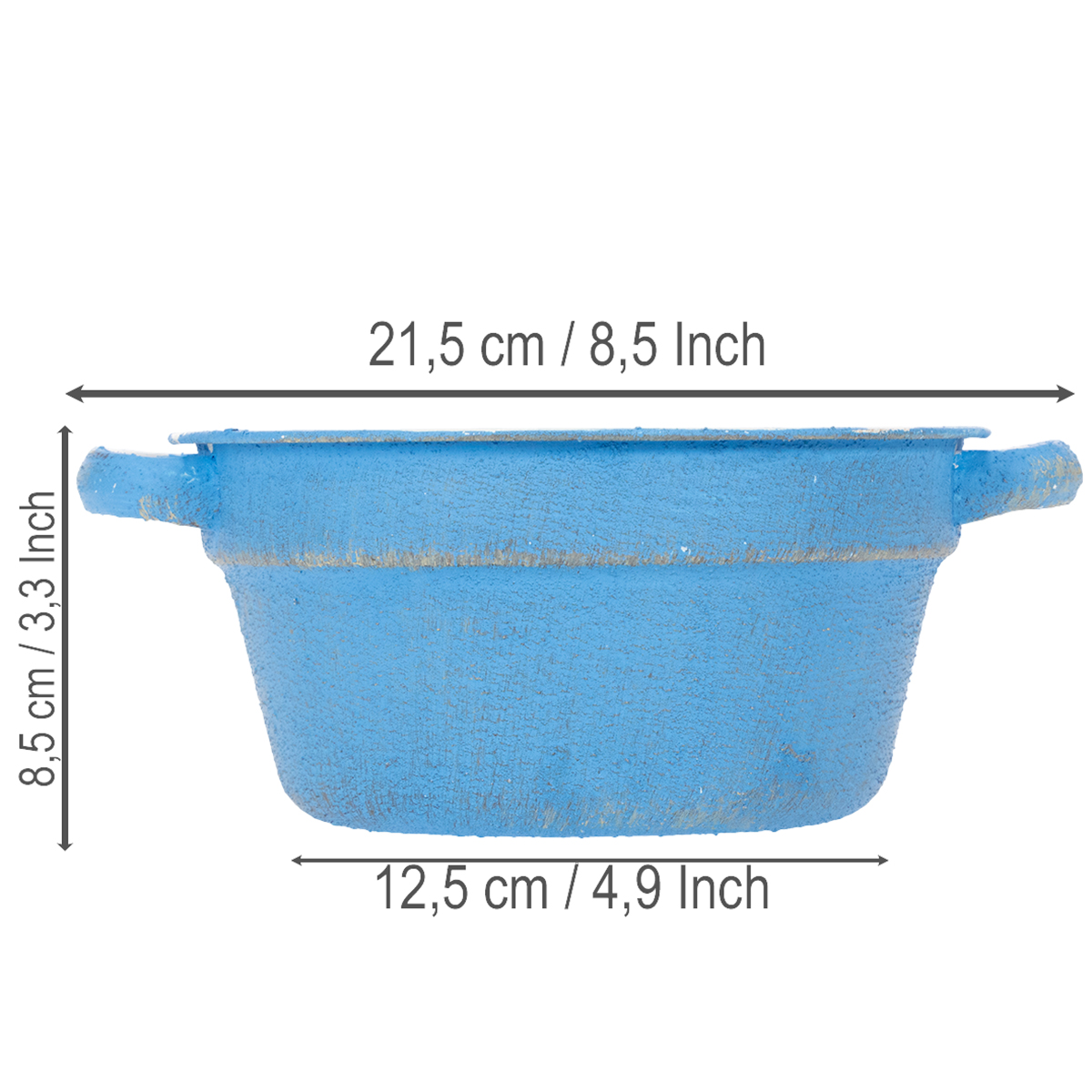 Le bol décoratif est en métal fin et est donc très léger. L'intérieur du pot décoratif est blanc, à l'extérieur la décoration en métal brille dans le plus beau bleu ciel. En raison de la surface rugueuse et des accents gris, la jardinière a l'air authentiquement ancienne. Une perle et deux petites anses permettent au bol décoratif d'être câblé ou décoré d'un ruban de jute si nécessaire.
