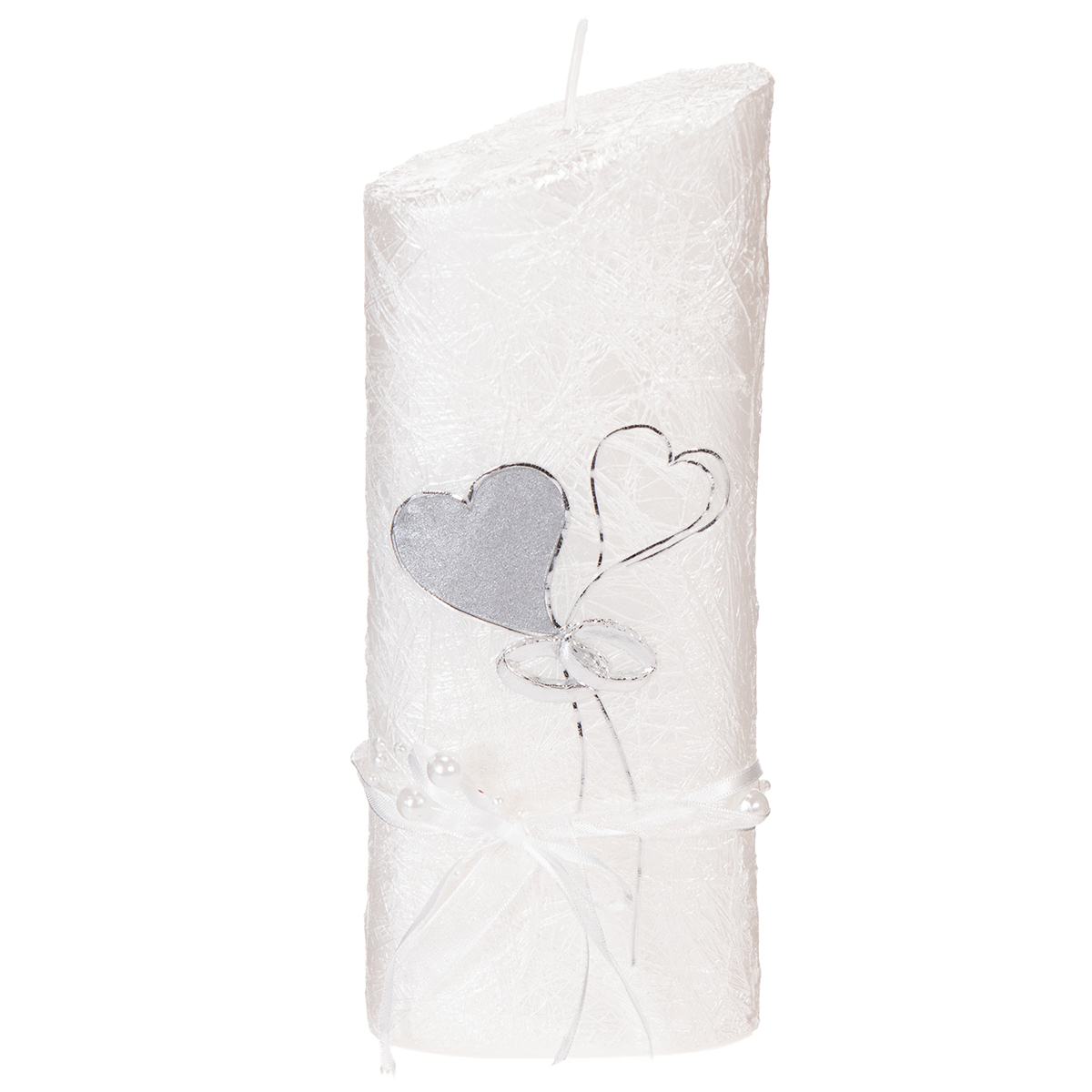 Cette élégante bougie de mariage blanche scintillante complétera à merveille votre décoration de table ! Son motif d'anneaux et de cœurs argentés en fait également un choix idéal pour un anniversaire de mariage d'argent.