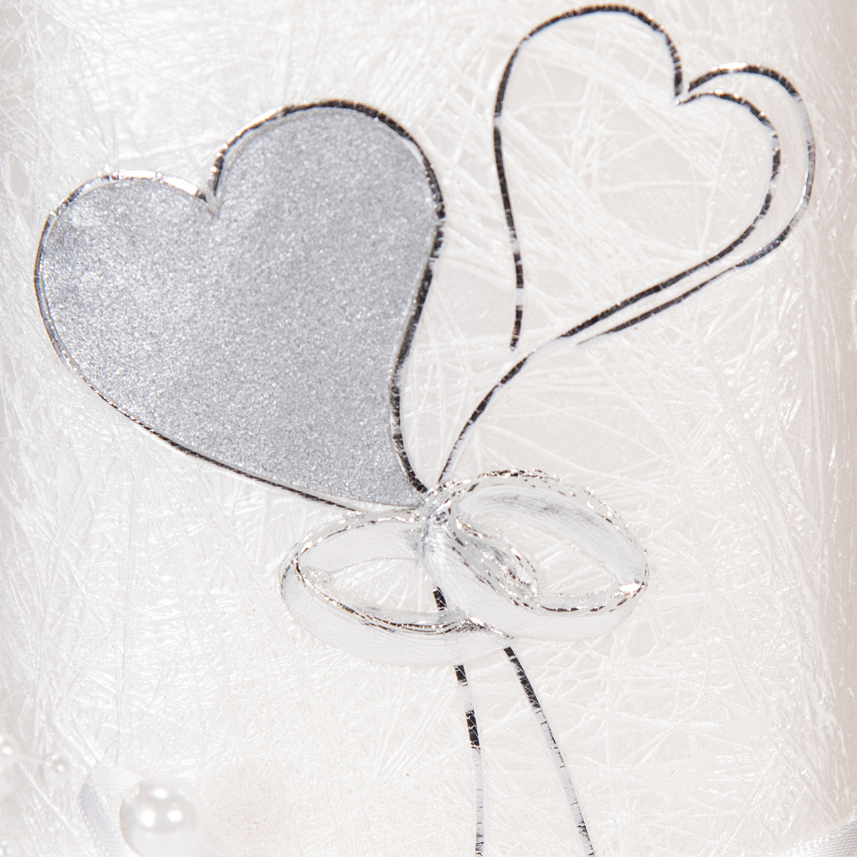Deux cœurs montés sur des tiges sont maintenus ensemble, tels un bouquet de fleurs, par deux anneaux entrelacés. La bougie de mariage est également ornée d'un ruban blanc et de perles, ce qui embellit la décoration. Toutefois, cette décoration doit être retirée avant d'allumer la bougie.
