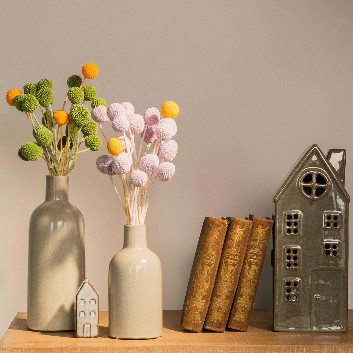 Utilisez le craspedia, par exemple, pour créer des compositions de table originales ou d'élégants bouquets d'automne. Pourquoi ne pas confectionner de charmantes couronnes ou embellir vos emballages cadeaux ? Laissez libre cours à votre créativité et associez le craspedia à d'autres fleurs séchées ou à des accessoires de décoration raffinés comme des vases et des bougeoirs. Vous transformerez ainsi n'importe quel élément de décoration en un écrin harmonieux.