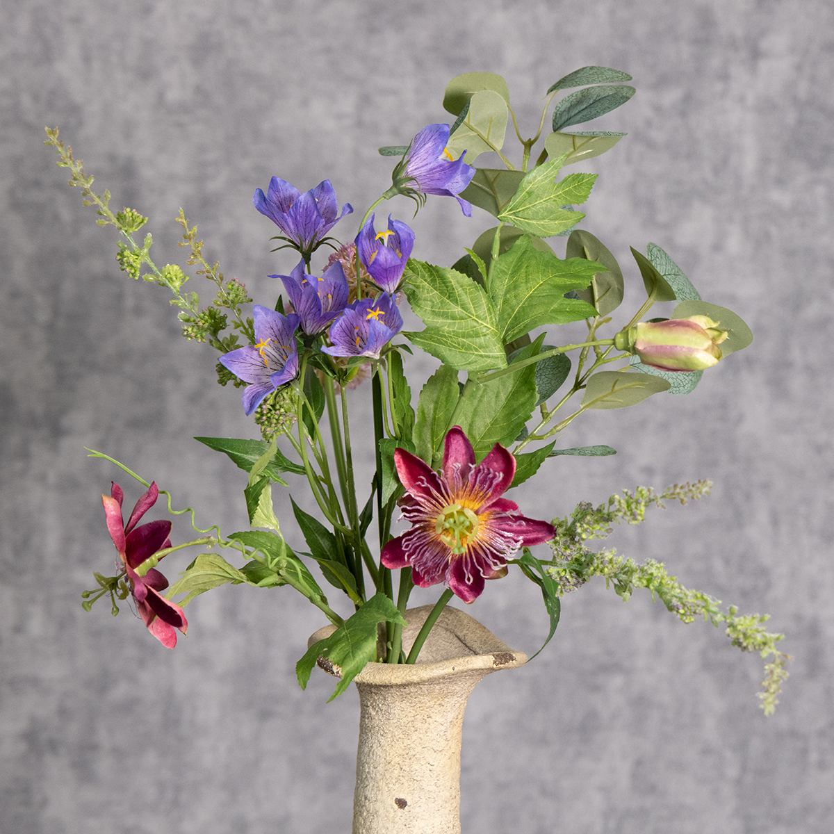 Les fleurs ont toujours revêtu une profonde symbolique. Les fleurs violettes représentent la créativité et l'inspiration, tandis que les touches de rouge symbolisent la passion et la vitalité. L'alliance de ces couleurs éclatantes insuffle une atmosphère positive et rafraîchissante à vos pièces. Qu'il soit moderne ou classique, ce bouquet exprime la joie de vivre et l'élégance.