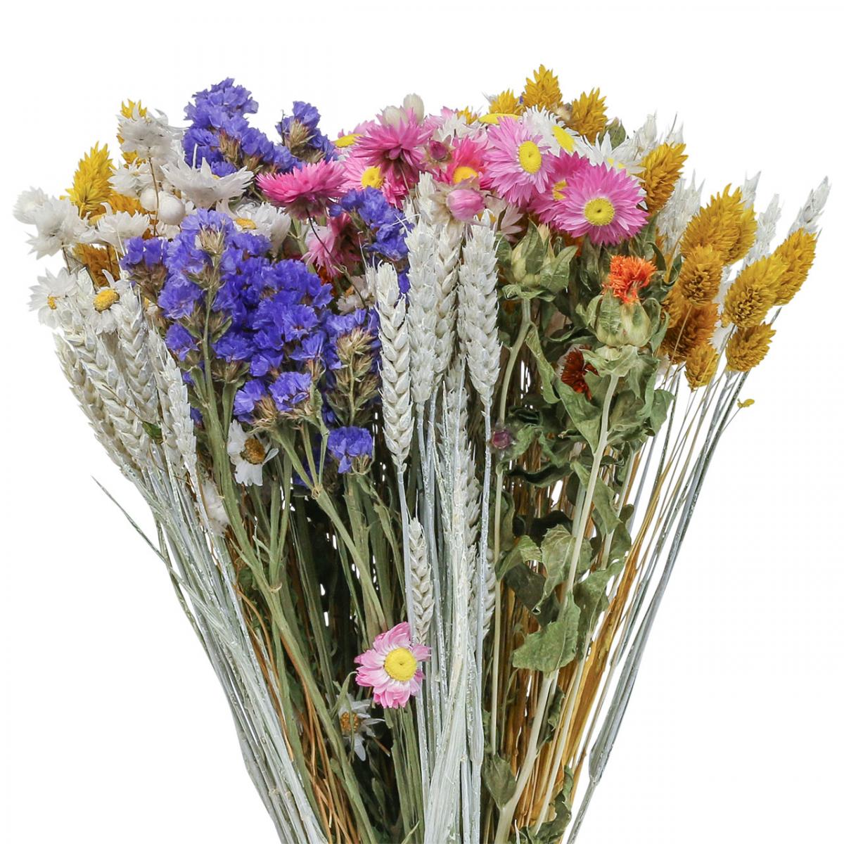Vous recevrez un bouquet bohème très complet de fleurs séchées composées de fleurs de paille colorées, de statice, de phalaris et de blé.