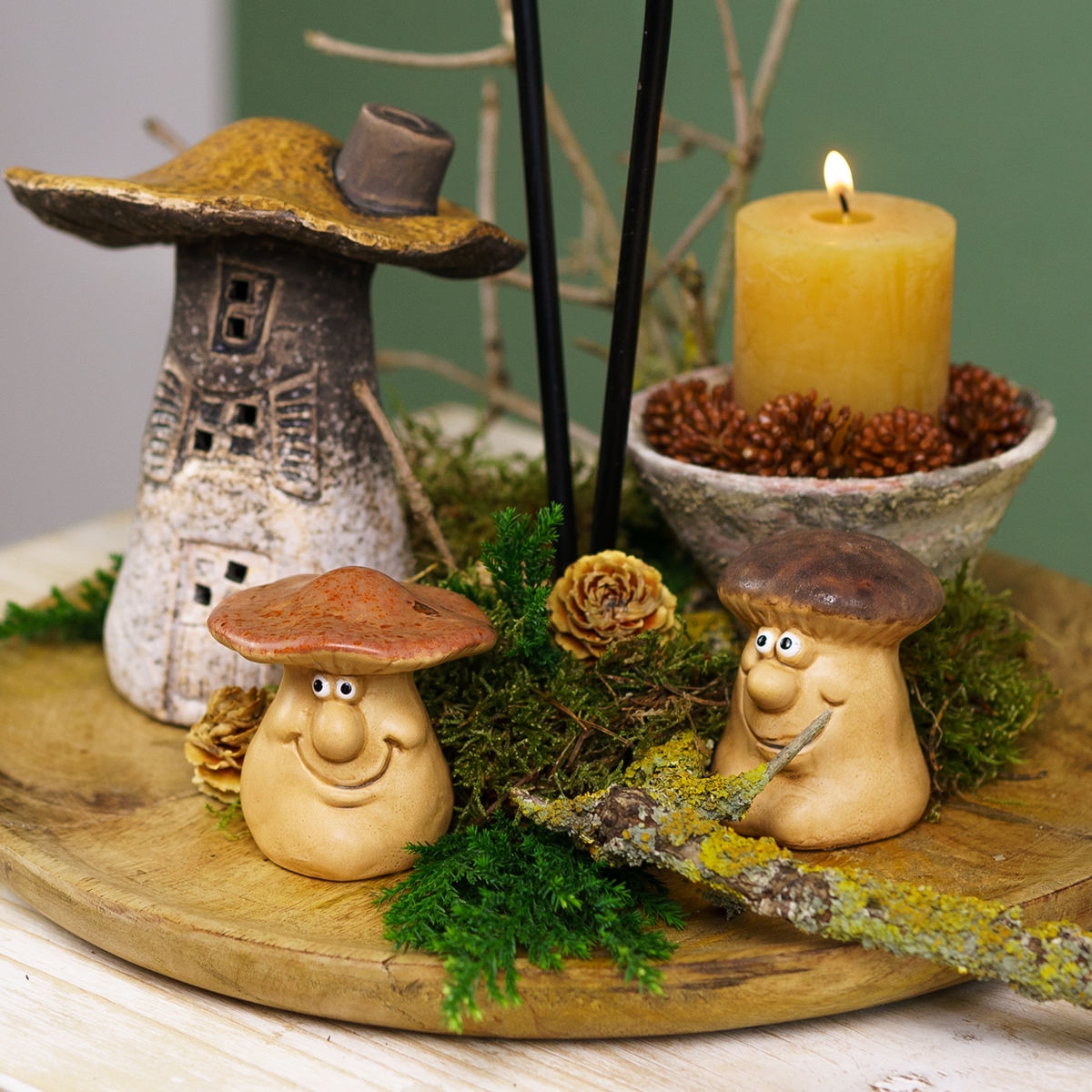 - Créez un rebord de fenêtre automnal avec des hérissons, des bâtons de fleurs et des champignons sur de la mousse décorative séchée de notre gamme.