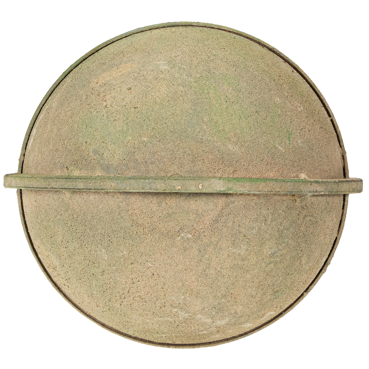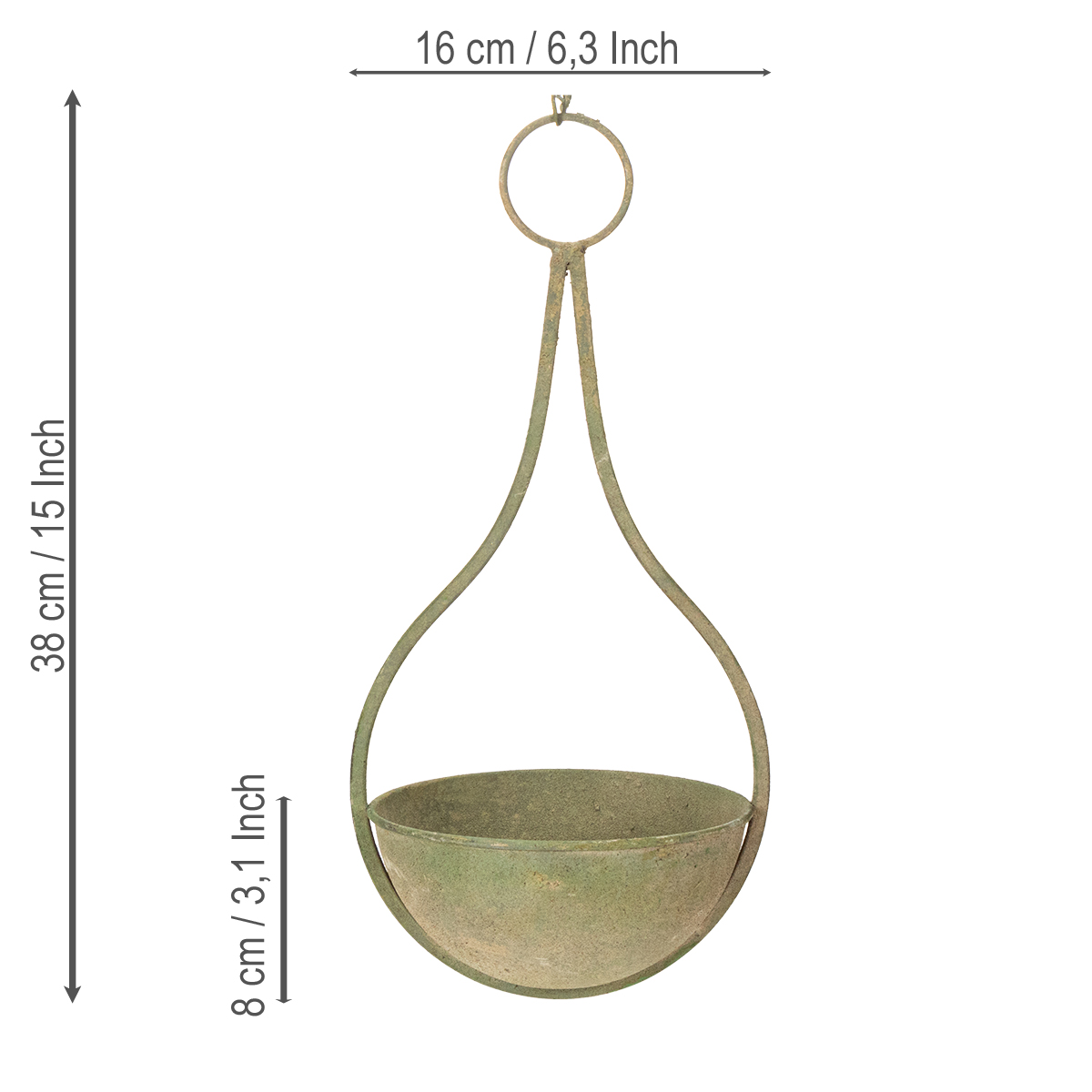 Le panier suspendu en métal se compose d'un bol rond qui est maintenu par un arc circulaire qui converge vers le haut.