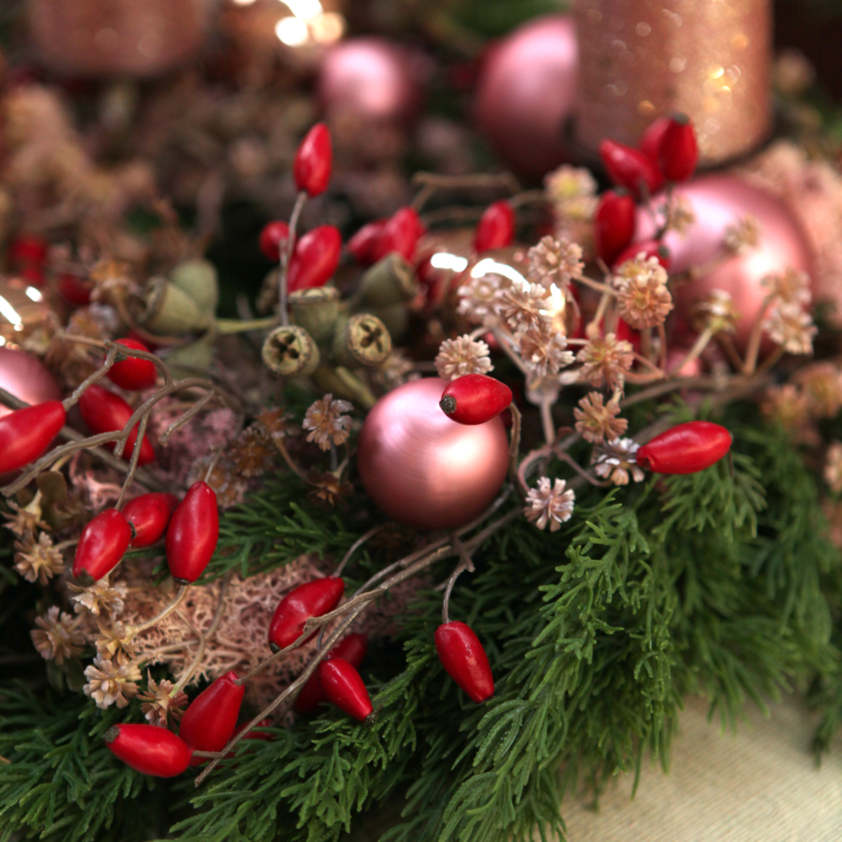 Le rouge symbolise la chaleur et la passion, parfaitement adapté à l'atmosphère chaleureuse de l'automne. Les cynorhodons évoquent également des thèmes comme le renouveau et la fertilité. Des touches de rouge confèrent à toute pièce une aura vibrante et positive. Surtout pendant les saisons plus sombres, une couronne rouge apporte une touche vibrante et énergique à votre intérieur.