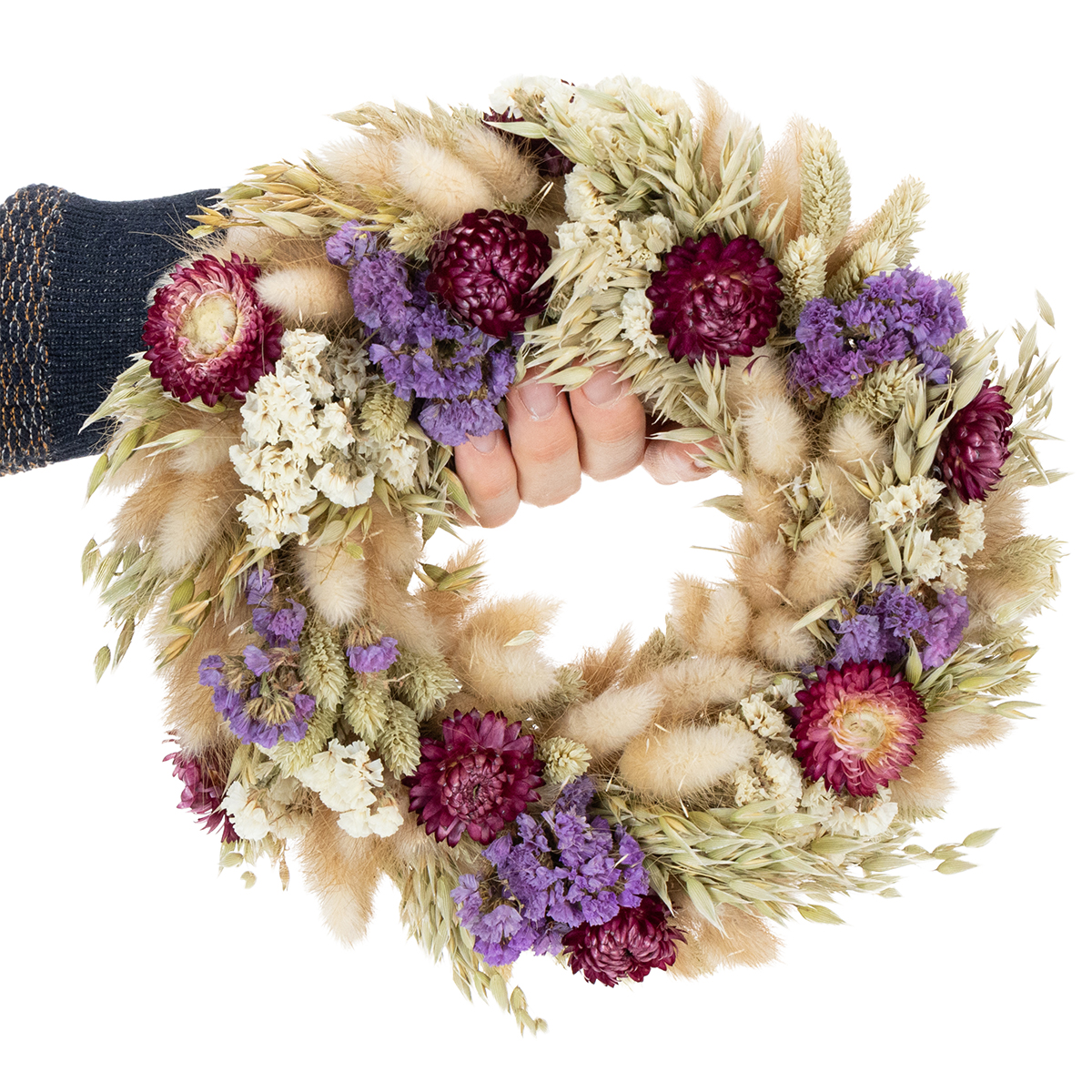 L'entretien est particulièrement simple : tapotez délicatement la couronne pour enlever la poussière et évitez l'exposition directe au soleil pour préserver les couleurs. Ainsi, votre décoration de fleurs séchées festives attirera toujours tous les regards !