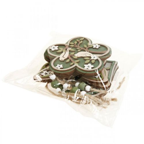 Un œillet métallique est attaché à chaque décoration suspendue en bois, à travers laquelle passe une boucle de ruban de jute. Des perles blanches et vertes sont également enfilées sur le cordon de jute.
