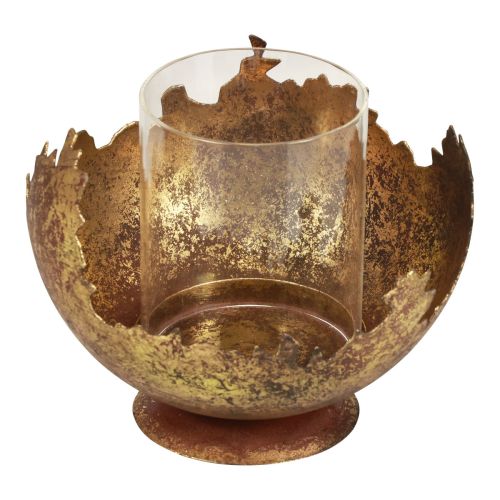 Ce bol lumineux en métal se présente sous la forme d'une lanterne avec un cylindre en verre amovible. La demi-coquille noire et brun rougeâtre avec une jolie cassure en forme de coquille d'œuf sur les bords à différentes hauteurs et une patine semblable à une feuille d'or est particulièrement belle comme décoration de table pour Noël !La décoration de table en métal possède une base ronde avec laquelle le bougeoir tient stablement et en toute sécurité dans la décoration de table. À l'intérieur du cylindre en verre, il y a de la place pour des bougies chauffe-plat et des bougies piliers jusqu'à un diamètre d'environ 7 centimètres et une hauteur d'environ 10 centimètres.