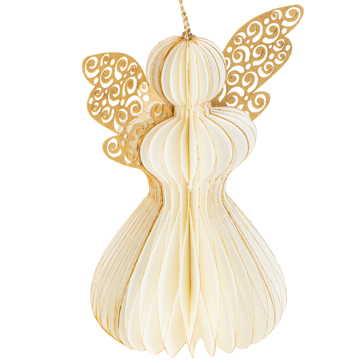 Ces anges décoratifs en papier apportent une touche d'élégance à votre intérieur. Leur design blanc et or ravira à coup sûr. Leurs ailes délicates, ornées de détails dorés, leur confèrent une allure à la fois raffinée et aérienne. Cet ange est non seulement un bel objet de décoration, mais aussi incroyablement pratique. Pliable et doté d'une fermeture magnétique, il se range facilement. Idéal pour optimiser l'espace ! Sur le sapin de Noël, à la fenêtre ou sur une table, cet ange embellit n'importe quel endroit.
