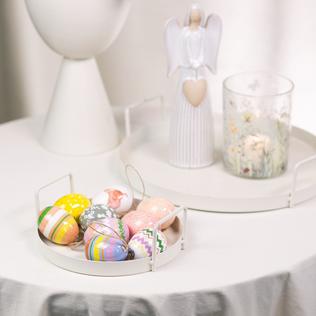 Ces charmantes décorations d'œufs de Pâques sont à la fois pratiques et élégantes. Chacune des douze miniatures est ornée avec soin de motifs délicats et séduit par le caractère intemporel de ses couleurs et de ses dessins. Leur taille pratique de 6 cm est idéale pour de nombreuses idées de décoration. Grâce à leur matière plastique robuste, ces décorations sont durables et résistantes – convenant aussi bien à l'intérieur qu'à l'extérieur abrité.