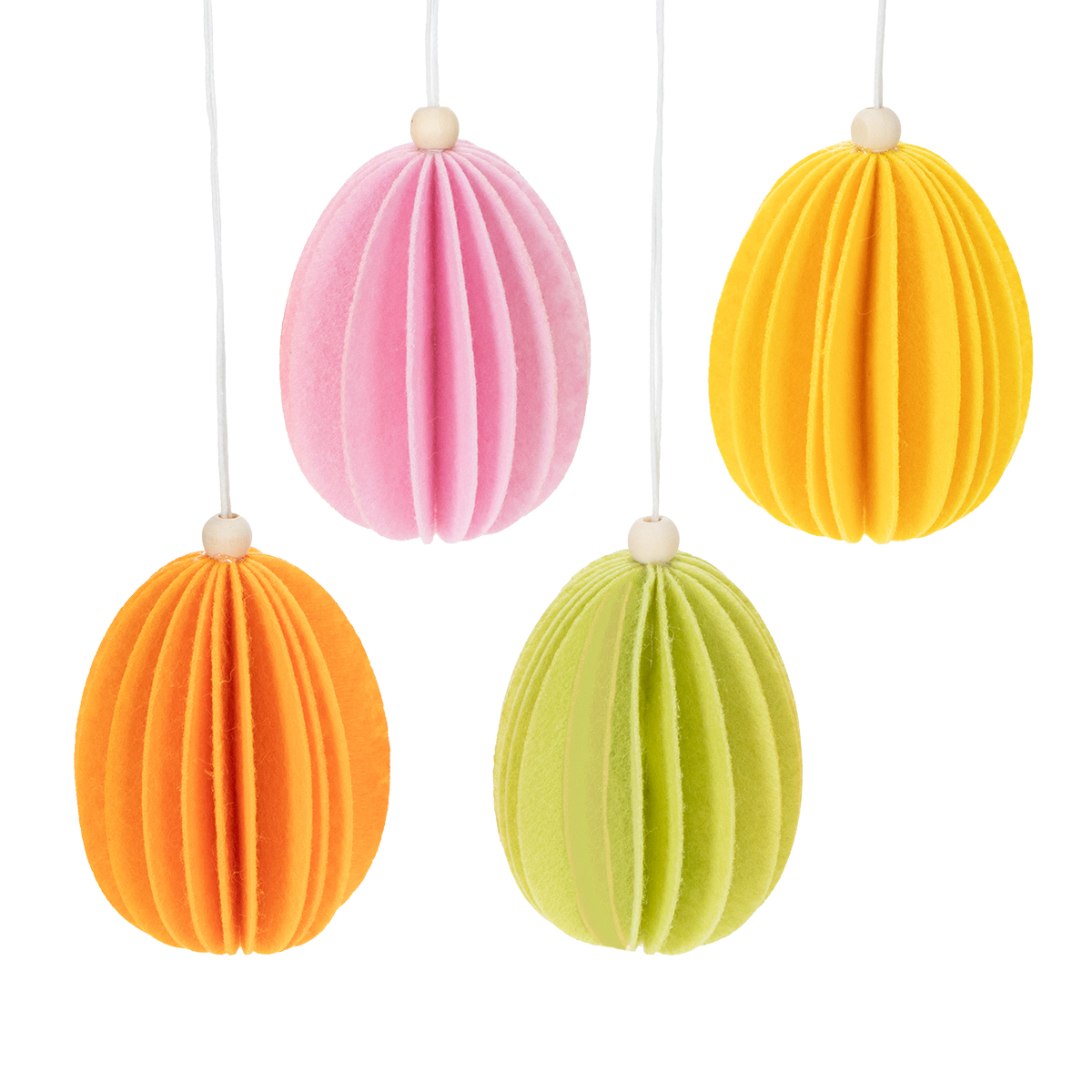 Pâques approche à grands pas et vous cherchez une façon simple et efficace d'égayer votre intérieur ? Nos décorations d'œufs de Pâques à suspendre, confectionnées en feutrine douce, créeront instantanément une ambiance printanière et chaleureuse dans votre salon et votre jardin. Leurs couleurs éclatantes – rose, jaune, orange et vert – apportent joie et dynamisme à n'importe quel espace : un vrai régal ! Suspendues aux rebords de fenêtres, aux branches ou même dans le jardin parmi les fleurs, ces décorations de Pâques embelliront n'importe quel endroit.