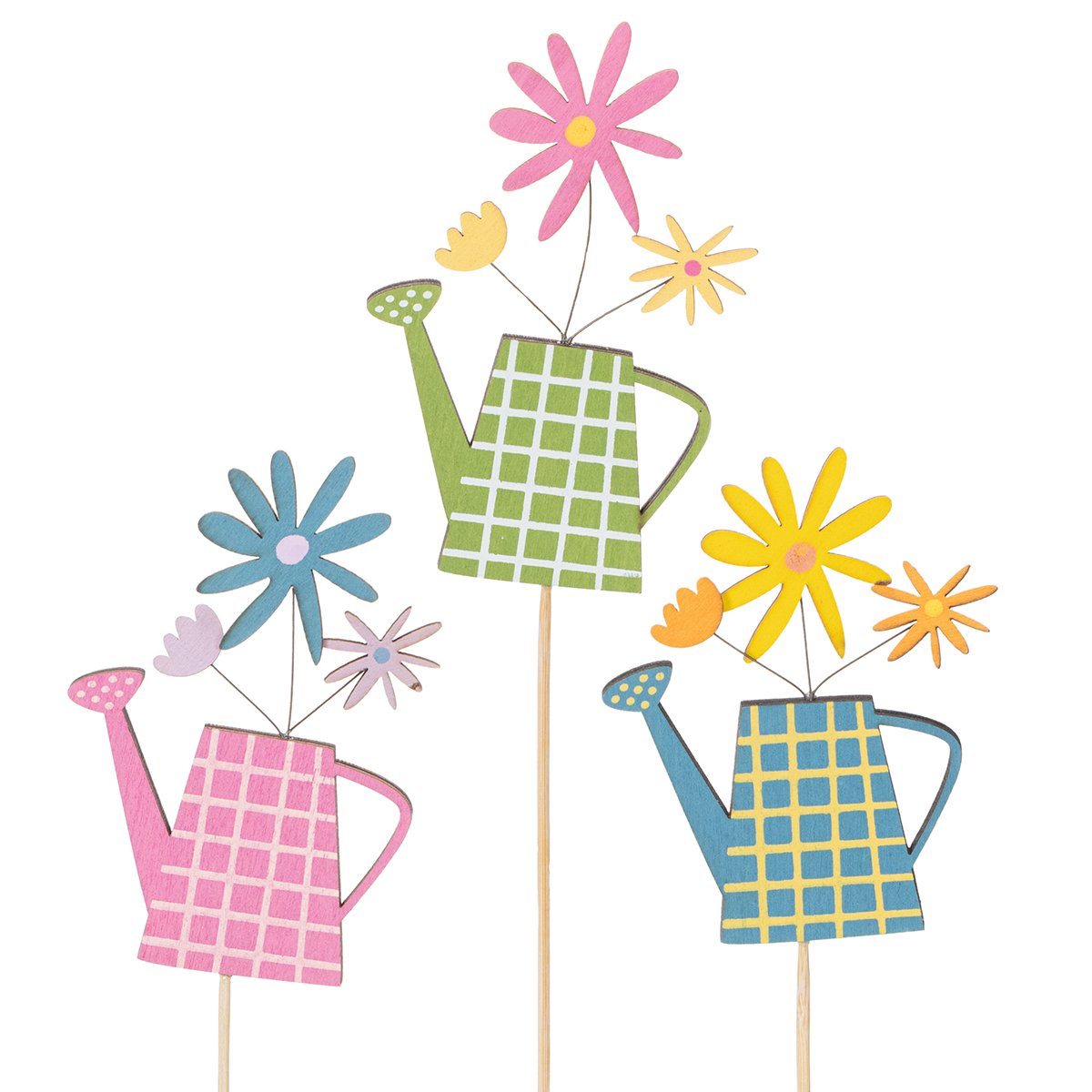 Décoration de jardin printanière avec des piquets en forme d'arrosoir