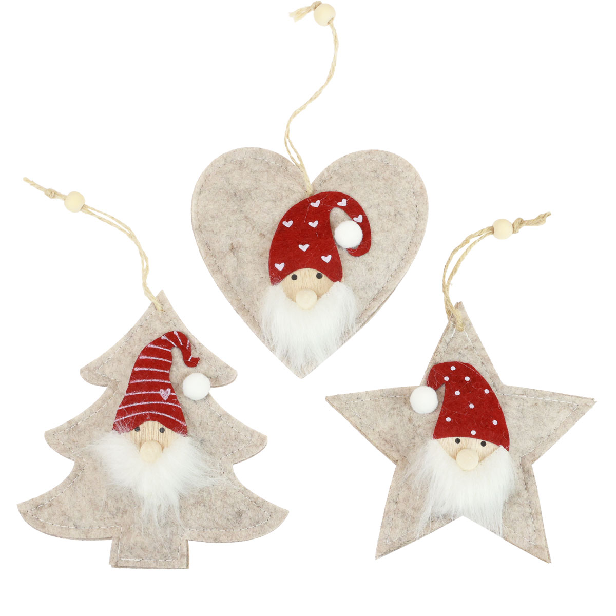 Les décorations pour sapin de Noël sont constituées de feutre gris chiné, légèrement rempli et donc légèrement courbé comme un oreiller. Les têtes des nains de Noël se composent d'un visage peint avec des yeux et d'une boule en bois pour le nez. Sur la tête, les nains décoratifs portent des chapeaux pointus rouges avec des pompons qui ont des rayures blanches, des pois ou un joli motif de cœur. Une barbe blanche et hirsute complète parfaitement le look des petits nains à suspendre.