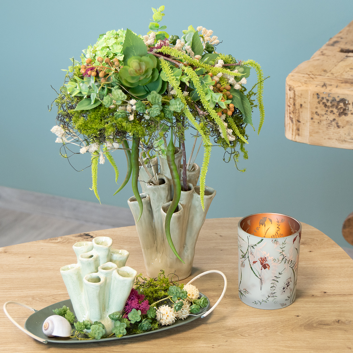Ce bougeoir élégant à motif floral est bien plus qu'un simple objet décoratif : il attire tous les regards ! Le délicat motif végétal aux tons beiges évoque la douceur des aquarelles, conférant au bougeoir un caractère à la fois naturel et raffiné. Le rebord intérieur métallisé reflète la lumière de la bougie et crée une ambiance envoûtante. Un véritable enchantement pour des soirées chaleureuses au salon ou sur la terrasse !