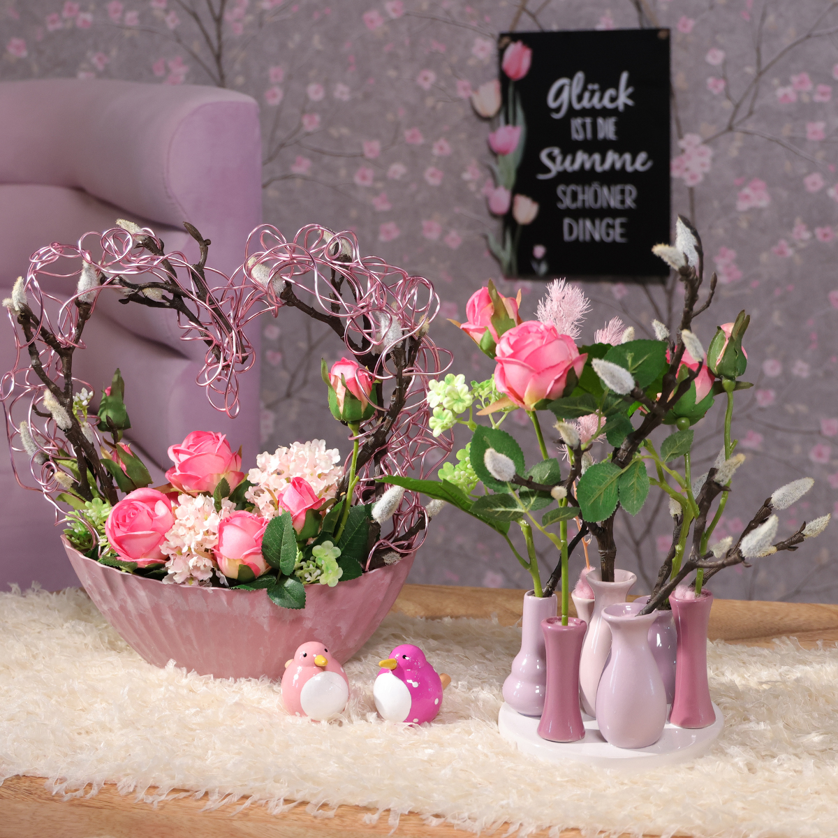 Envie d'une touche d'originalité pour votre intérieur ? D'un élément qui apporte fraîcheur, élégance et une pointe de modernité ? Cet ensemble de vases aux teintes pastel, en céramique de haute qualité, pourrait bien être la solution idéale. Les six vases aux formes artistiques, associés à une base robuste en céramique blanche, offrent une grande polyvalence : de la décoration de table à l'ornement d'étagère. Qu'ils soient garnis de fleurs fraîches, de petits bouquets de fleurs séchées ou simplement exposés individuellement comme de jolis objets décoratifs, ces petits vases apportent toujours une touche raffinée. L'harmonie des teintes roses et violettes crée une atmosphère à la fois apaisante et chaleureuse. Un choix parfait pour celles et ceux qui apprécient le style et la fonctionnalité et souhaitent donner à leur intérieur une allure contemporaine.