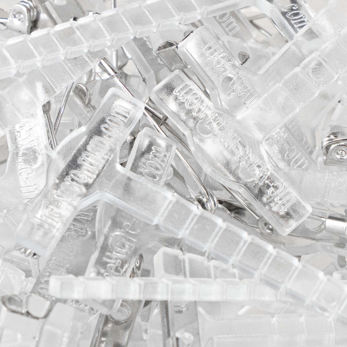 Notre broche de mariage en plastique transparent avec son épingle argentée est disponible en boîtes de 50 pièces ayant une longueur d’environ 5 cm. Vous pourrez aussi utiliser ces broches comme support pour des porte-noms lors d’un workshop, pour faire tenir des petites figurines lors d’une soirée à thème ou pour réaliser la décoration florale avant un gala.