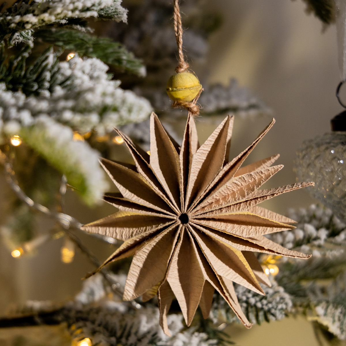 Nos étoiles en papier aux couleurs naturelles attirent tous les regards et sont incroyablement pratiques. Leur palette de couleurs discrète crée une ambiance chaleureuse et conviviale sans être envahissante. La perle jaune en polystyrène apporte une touche de couleur subtile qui se marie particulièrement bien avec des guirlandes lumineuses ou d'autres matériaux naturels comme le bois ou les pommes de pin. Vous pouvez utiliser ces étoiles de multiples façons : les suspendre au sapin de Noël, à une couronne ou décorer vos fenêtres. Elles sont particulièrement spectaculaires associées à des lumières blanches ou dorées.