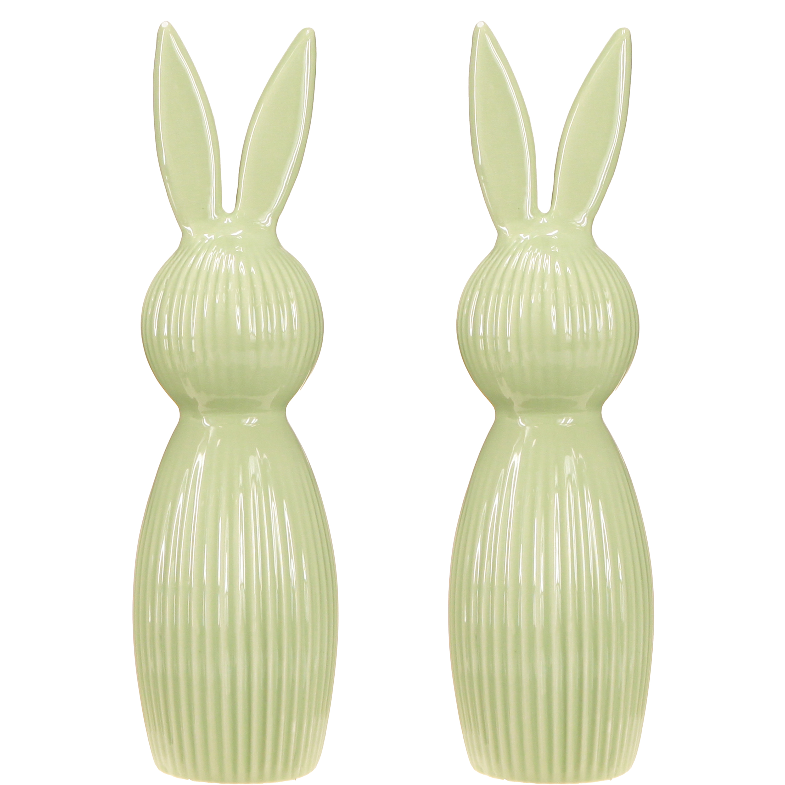 Mesurant 22 cm de hauteur et 7 cm de diamètre, ces figurines de lapins sont d'une taille idéale : discrètes et élégantes, elles attirent le regard. Fabriquées en céramique de haute qualité, elles séduisent par leur robustesse et leur style intemporel. Leur surface vert pastel évoque la légèreté et la fraîcheur, parfaites pour le printemps ! Le motif rainuré crée un subtil effet 3D qui leur donne vie.