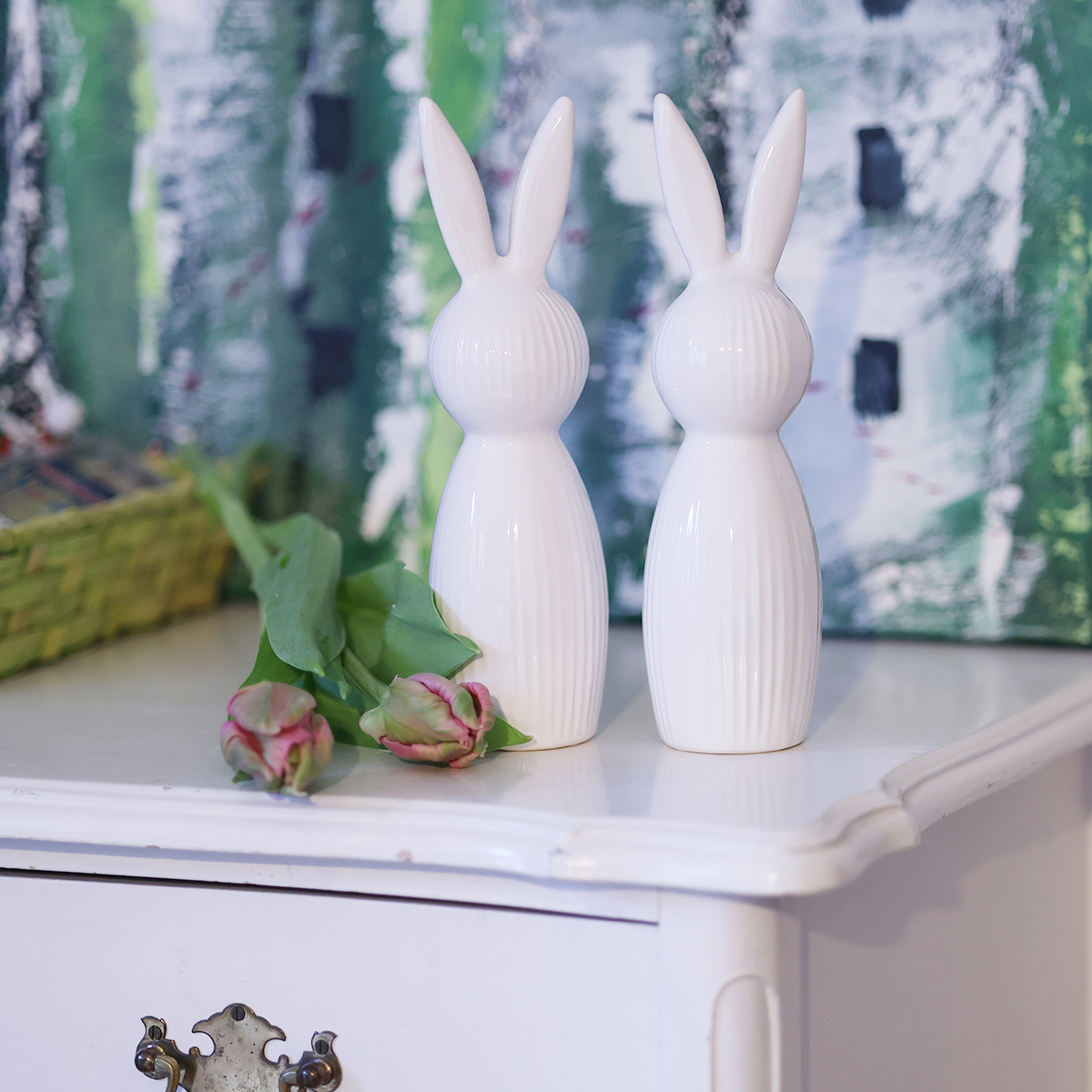 Cette figurine de lapin, d'une simplicité raffinée et réalisée en céramique de haute qualité, se distingue par son design minimaliste et sa fonctionnalité. Sa surface brillante lui confère une profondeur et un éclat particuliers, en faisant instantanément la pièce maîtresse de votre décoration. Parfaite pour les décorations de printemps et de Pâques, elle trouvera sa place sur la table pascale, dans un bouquet de Pâques moderne ou comme élément décoratif discret sur votre bureau. Sa hauteur de 22 cm offre un équilibre idéal entre présence et élégance sobre. La surface légèrement nervurée est un véritable plaisir pour les yeux et le toucher. Les amateurs d'élégance discrète apprécieront sa couleur blanche neutre, qui s'harmonise avec presque tous les styles : chandeliers en verre modernes, vases minimalistes ou autres accessoires printaniers aux tons clairs. Libre à vous de les exposer seuls ou par paire ! Un petit conseil : associez-les à d'autres éléments décoratifs en céramique blanche ou à des touches pastel pour créer des accents harmonieux et une décoration printanière réussie.