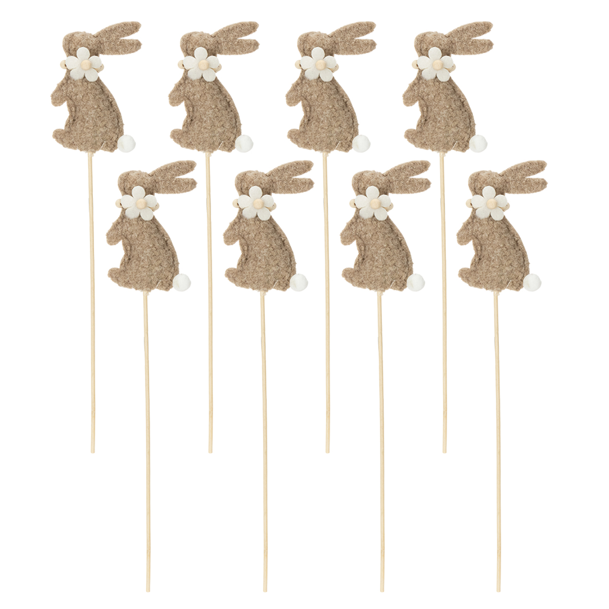 Ces décorations sur piquet de 42 cm de haut apportent une touche de fraîcheur à vos compositions printanières. Pourquoi ne pas les associer à des fleurs fraîches ou les disposer dans un panier en osier ? Ces lapins sont parfaits pour l’intérieur comme pour l’extérieur. Décoration de table pour le petit-déjeuner de Pâques ou aménagement de votre jardin, ces figurines s’adaptent à toutes les envies, à l’image du printemps. Avec huit pièces dans le paquet, laissez libre cours à votre créativité !