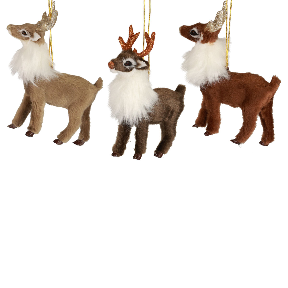 Les trois personnages de Noël ont leurs pattes avant avancées et une patte arrière est pliée. Leurs bois courts et scintillants ressemblent plus à des rennes ou à des chevreuils qu'à des bois de cerf. Le renne brun aux bois cuivrés se démarque particulièrement dans les décorations de Noël.