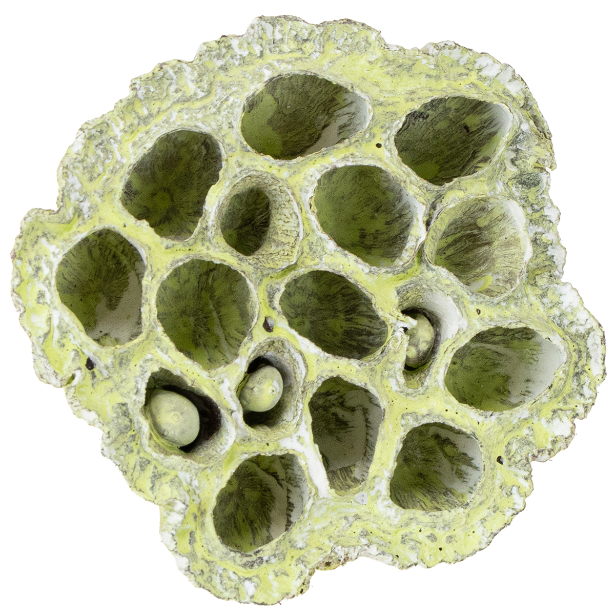 Nos fruits de lotus séchés et blanchis sont livrés en sachet de 50 pièces. Légèrement verdâtres, ils ont une taille d’environ 5 à 8 cm et un diamètre qui atteint selon le cas entre 6 et 10 cm.