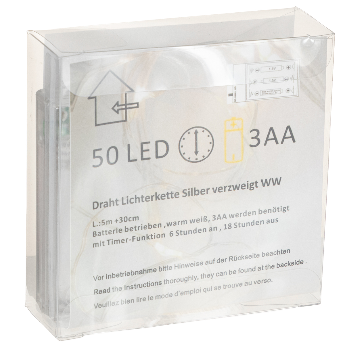 Cette guirlande lumineuse LED de 5 mètres de long, alimentée par piles et diffusant une lumière blanche chaude, ne nécessite que 3 piles AA pour illuminer ses 50 LED individuelles, espacées de 10 centimètres. Le fil reliant les piles à la première LED mesure 30 centimètres.