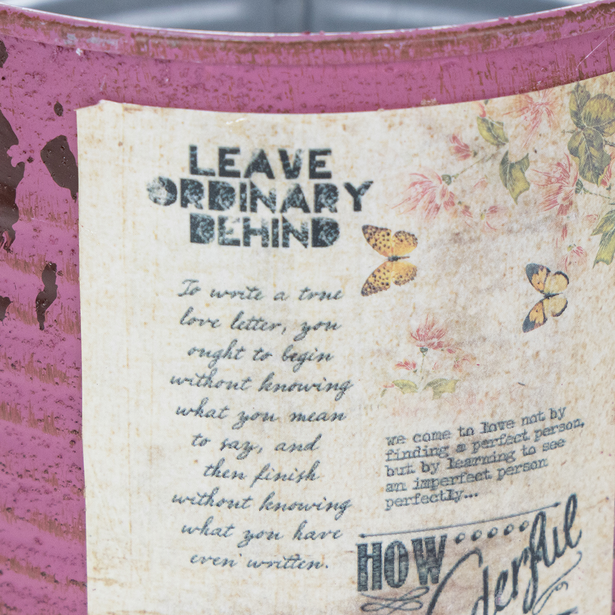 Cette jardinière vintage se présente habilement comme une boite décorative en violet. La décoration d'été en métal est joliment bicolore : on aperçoit un brun rouille chaud sur les rainures de la boîte de conserve. Le ton pastel violet est harmonieusement arrondi. Une étiquette avec des papillons et une inscription dans différentes polices rétro ainsi que des taches de rouille peintes sur le pot créent une atmosphère de plantation nostalgique.