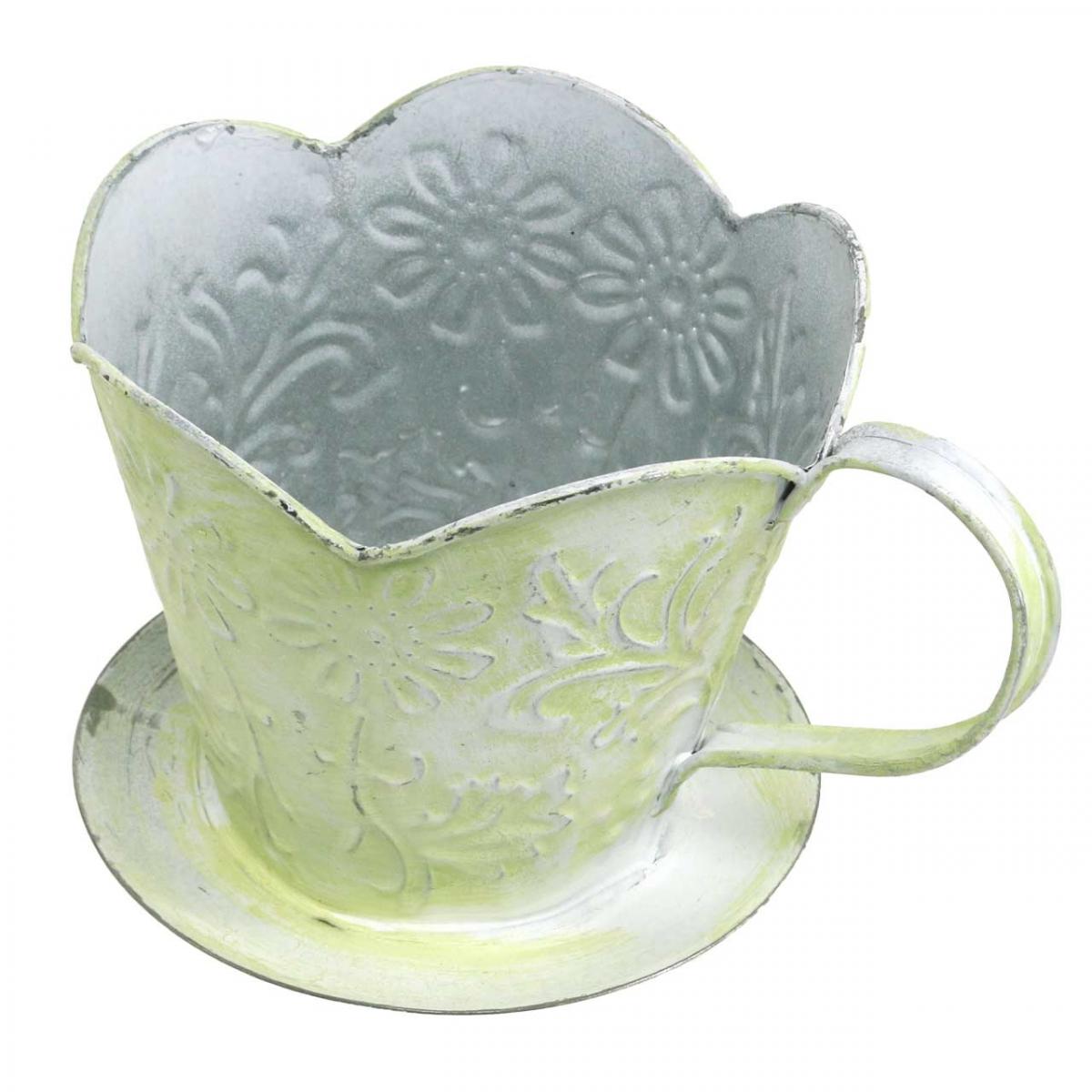 Cette jardinière originale aux allures de porte-filtre à café décoratif en métal est parfaite pour toute décoration de table ! La coupelle en métal pour la plantation a une décoration florale en relief faite de plantes à fleurs et de vrilles. De plus, la jolie tasse avec soucoupe est ondulée comme des pétales sur le dessus et présente un design marbré vert et blanc dans un style shabby chic tendance, de sorte que le fond argenté brille partiellement.