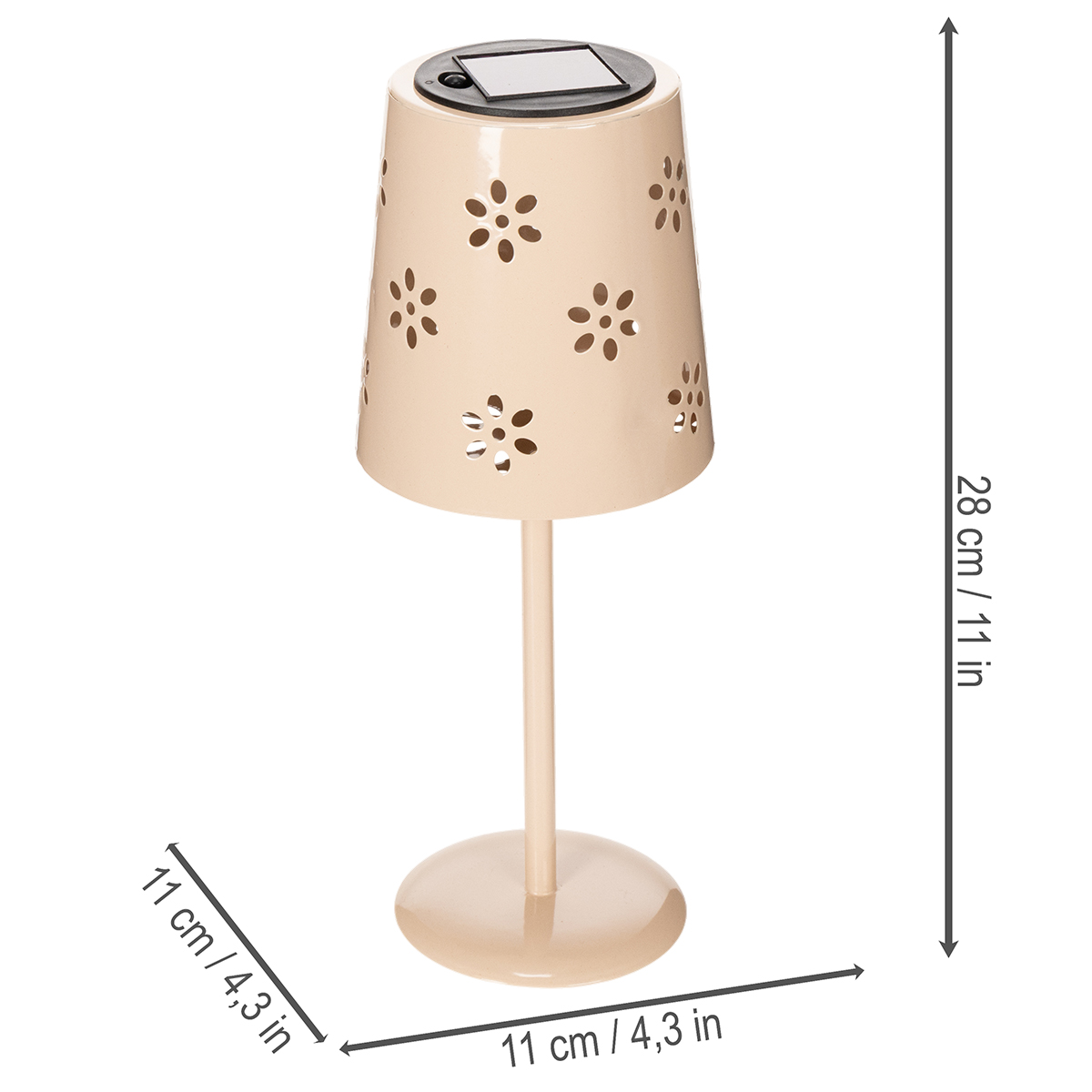 Cette lampe solaire d'extérieur est un véritable atout. D'une hauteur de 28 cm, son design charmant embellit n'importe quel coin de votre jardin : table, palier d'escalier ou muret. Sa lumière LED blanc chaud offre un éclairage doux et agréable, sans éblouissement, créant ainsi une ambiance chaleureuse. Fabriquée en métal robuste de haute qualité et dotée d'une jolie finition beige rosé, elle est conçue pour durer.