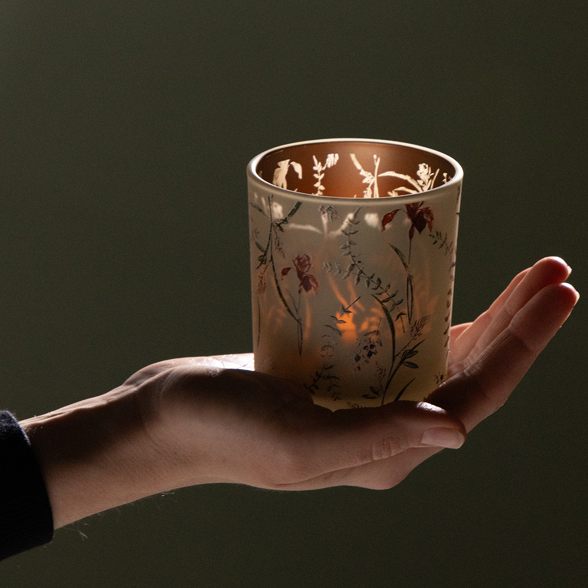 Cette lanterne décorative en verre séduit par son design raffiné, orné de motifs floraux beiges, verts et rouges qui créent une harmonie visuelle. Mesurant 8 cm de hauteur et 7,5 cm de diamètre, elle trouve facilement sa place sur une table, une étagère ou un rebord de fenêtre. Le verre de haute qualité, délicatement décoré de fleurs et d'herbes, apporte une touche de romantisme vintage à toute pièce. Utilisée comme bougeoir ou simplement comme objet décoratif, cette lanterne ne manquera pas de faire sensation. Son charme particulier réside dans le motif floral, qui prend véritablement vie à la lueur des bougies. Les reflets chauds de la lumière créent une ambiance cosy chaque soir, invitant à la détente. Pour les amateurs de style naturel, elle se marie à merveille avec des éléments en bois ou des matériaux naturels. Grâce à sa palette de couleurs neutres, la lanterne s'accorde aussi bien avec les intérieurs minimalistes que rustiques. Pratique, le lot comprend quatre lanternes que vous pouvez disposer à votre guise : individuellement, en groupe ou en centre de table.