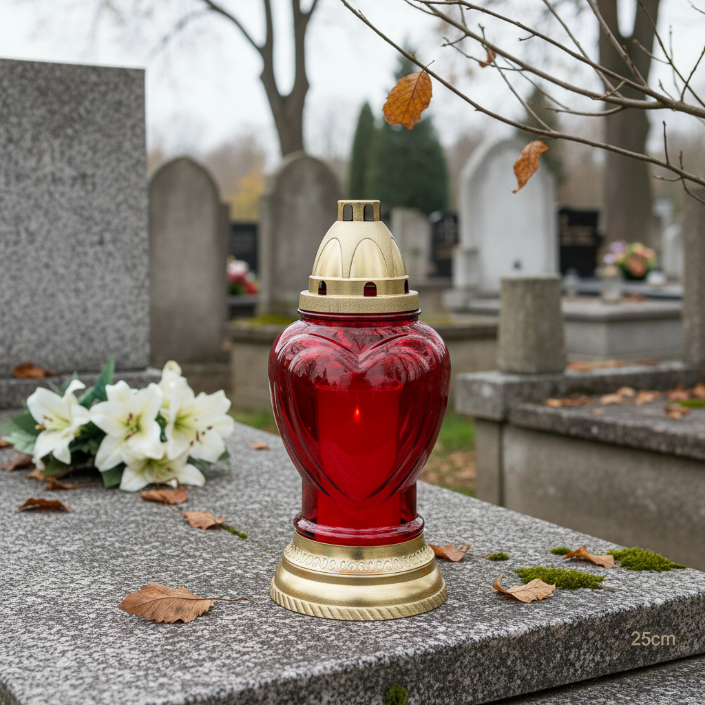 La lanterne funéraire est décorée d'un cœur en relief intemporel sur les deux faces, lui conférant une allure élégante. Le couvercle et le pied, en plastique, présentent également une belle forme.