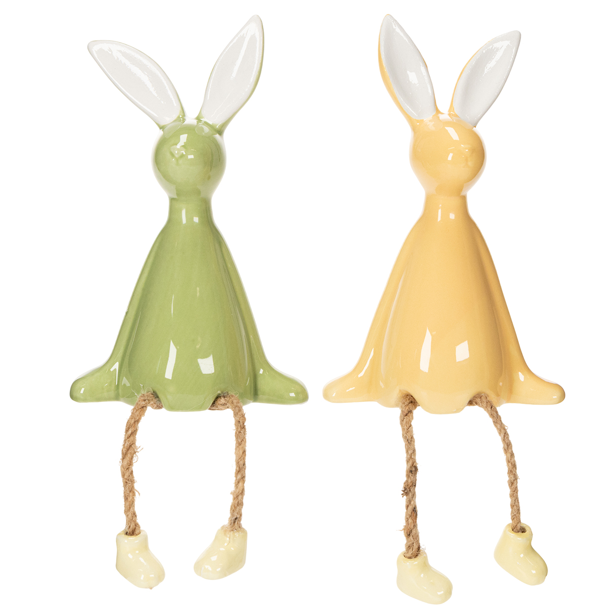 Apportez le printemps chez vous avec ces lapins de Pâques. L'un brille d'un doux vert pastel, tandis que l'autre illumine votre intérieur d'une douce chaleur ensoleillée grâce à sa teinte jaune. La délicatesse de la céramique de haute qualité leur confère à la fois robustesse et élégance. Leurs pieds en corde de jute soulignent leur aspect naturel et ajoutent une touche ludique. Parfaits pour être posés sur un rebord de fenêtre, une étagère ou le bord d'une table d'appoint, ces lapins créent une ambiance décontractée et conviviale. Leurs couleurs variées vous permettent de les associer facilement à d'autres objets décoratifs. Par exemple, mariez-les avec un panier en osier rempli d'œufs de Pâques ou agrémentez-les de fleurs printanières fraîches pour une ambiance champêtre. Pour tous ceux qui apprécient une décoration joyeuse et naturelle, ces lapins de Pâques sont un incontournable.
