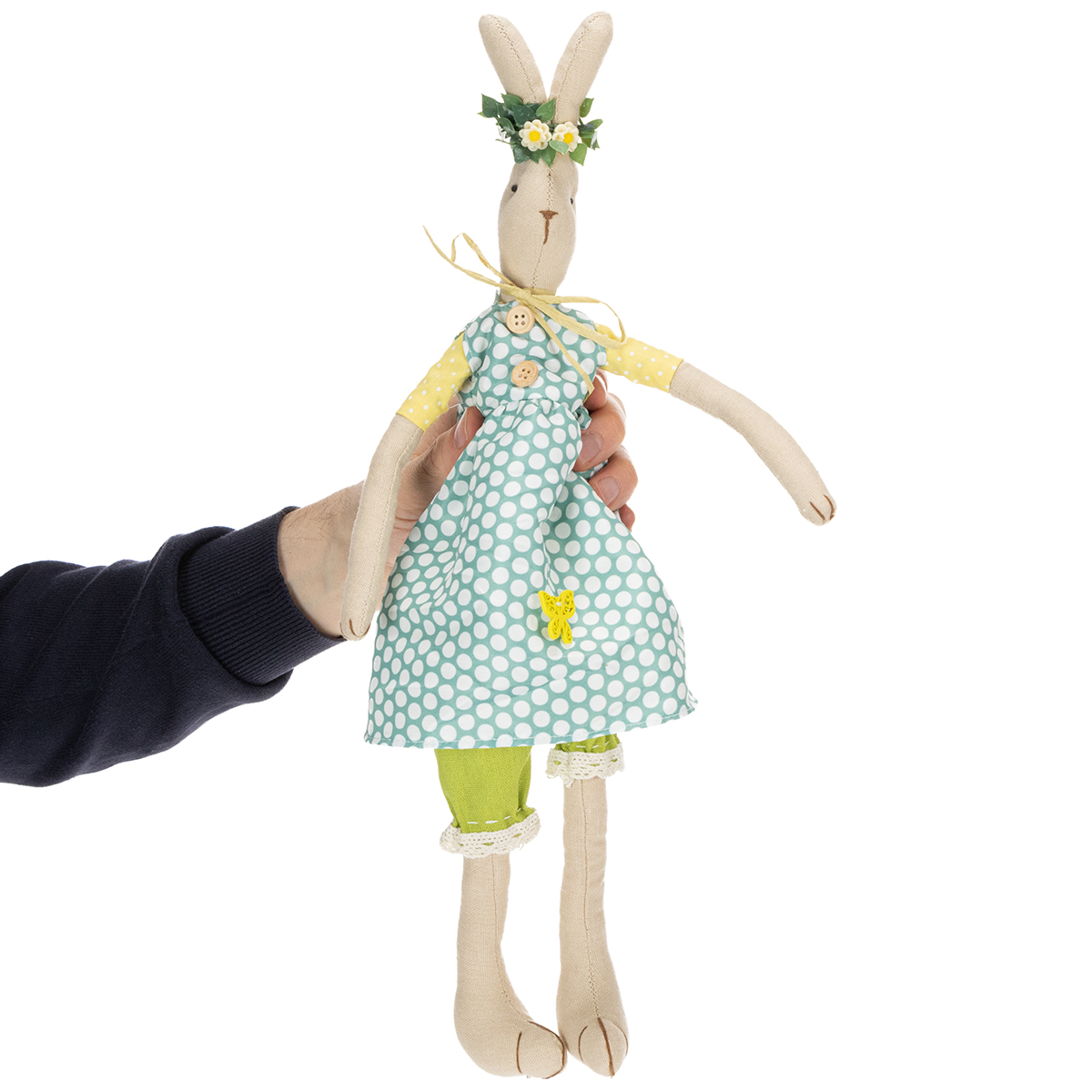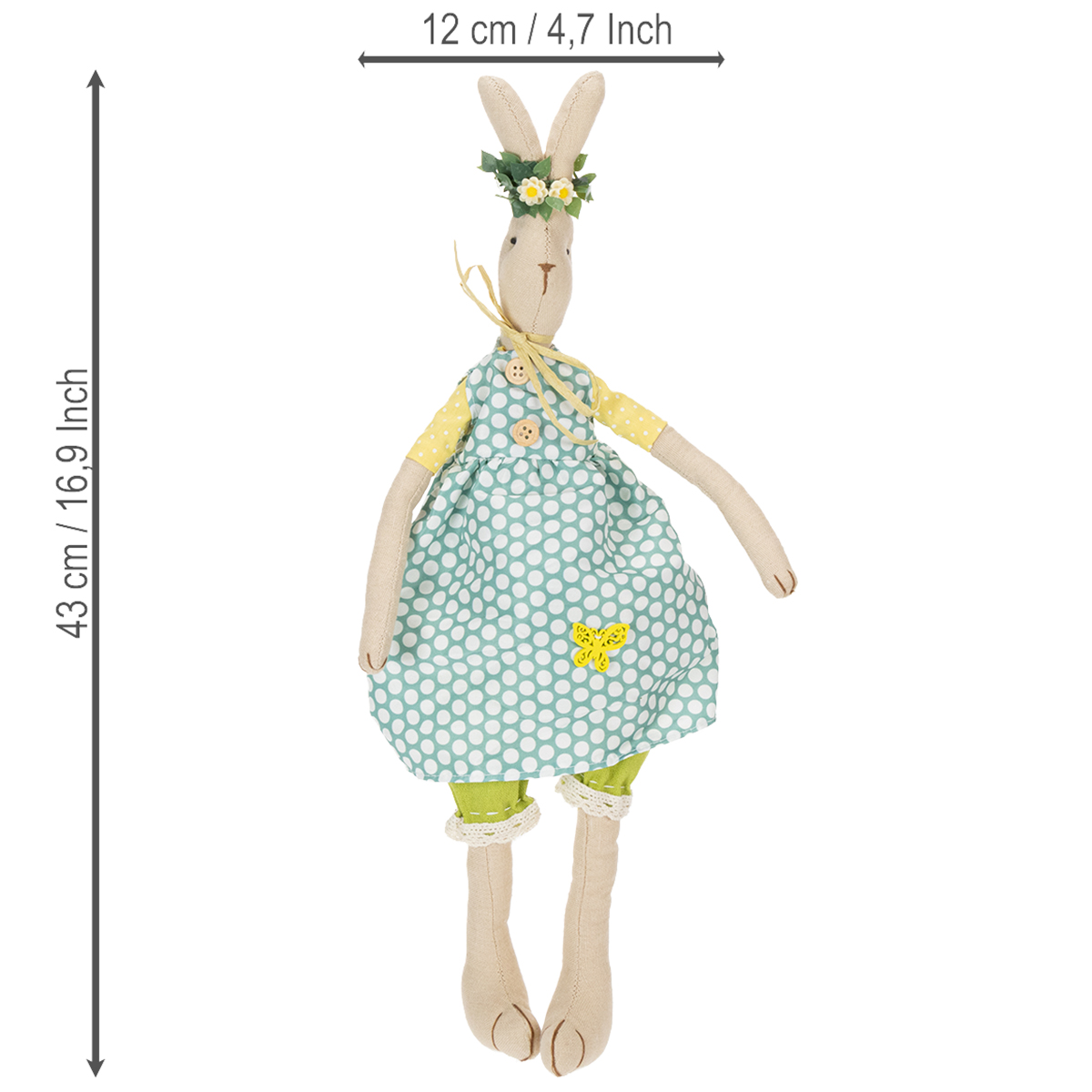 La jolie lapin est faite d'un simple tissu naturel et porte une robe bleue printanière à gros pois blancs. En dessous, des manches en jaune et blanc et un joli sarouel vert avec des bords en dentelle complètent la tenue du lapin avec robe. Le beau lapin enchante également avec de merveilleux détails tels que des boutons en bois et une décoration de papillon sur la robe ainsi qu'un simple nœud en ruban de papier autour du cou. Le lapin en peluche porte une couronne de fleurs en filigrane sur la tête, ce qui complète son look.