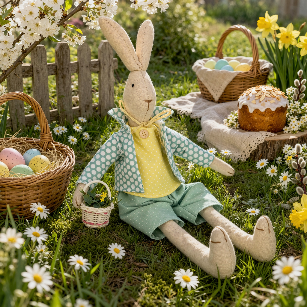 Ce lapin a été fabriqué à la main avec une grande attention aux détails. Le lapin était en tissu naturel et vêtu d'une chemise jaune à pois blancs et boutons en bois, d'un pantalon et d'une veste assortie en turquoise, également avec un motif à pois. Le lapin de Pâques porte un simple nœud en papier autour du cou. L'homme aux lapins a apporté un petit panier de fleurs planté.