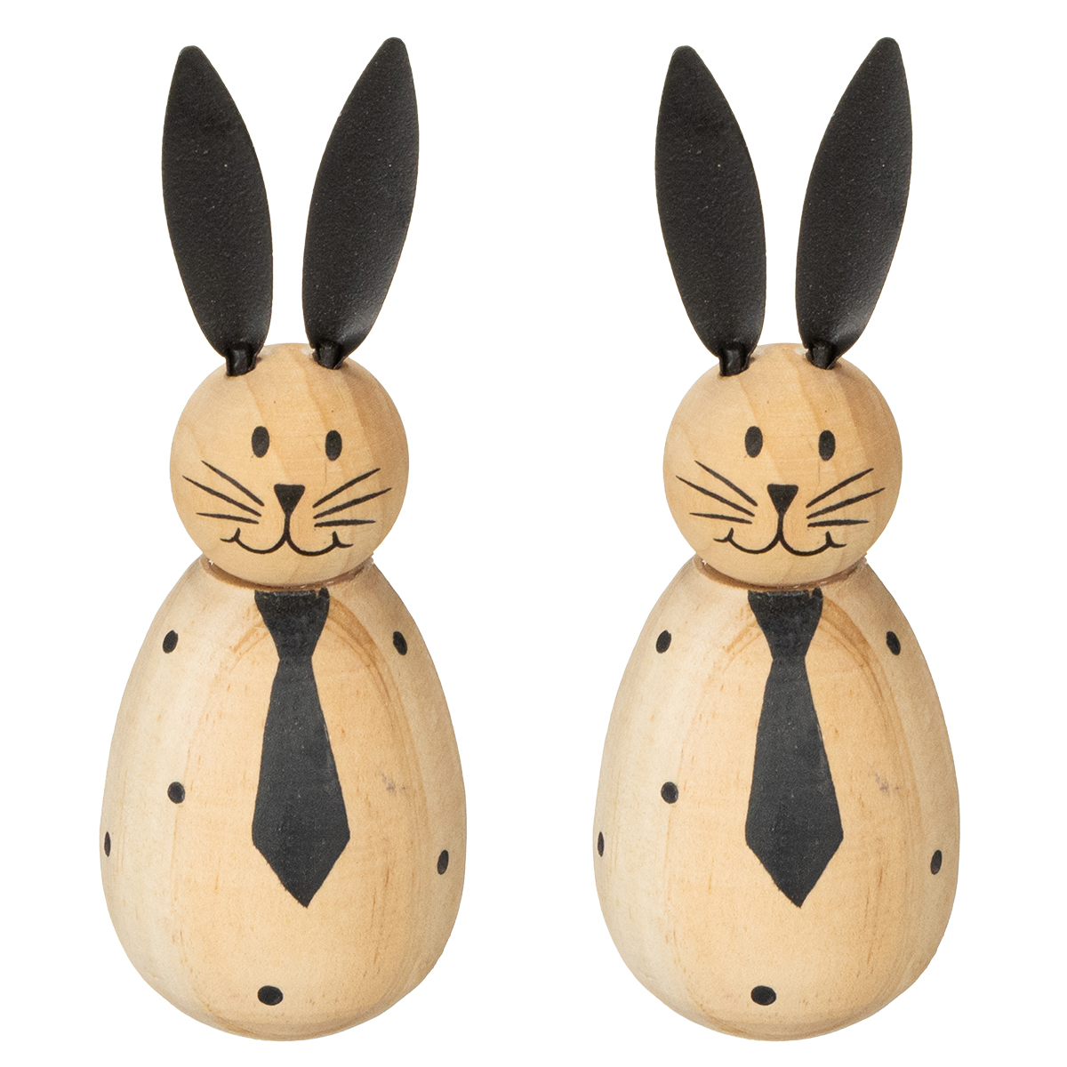 Ces figurines de lapins séduisent par l'harmonie des matières, des couleurs et des formes. Leur corps en bois naturel, d'une teinte claire et chaleureuse, est orné de petits points discrets. Les oreilles en métal noir mat et la cravate fantaisie apportent une touche de modernité à l'ensemble. Leur taille pratique (12 cm de hauteur et 4,5 cm de diamètre) les rend idéales pour de nombreuses décorations. Qu'elles soient disposées en groupe pour Pâques ou seules sur un rebord de fenêtre, ces figurines de lapins insufflent un charme particulier à toute composition.
