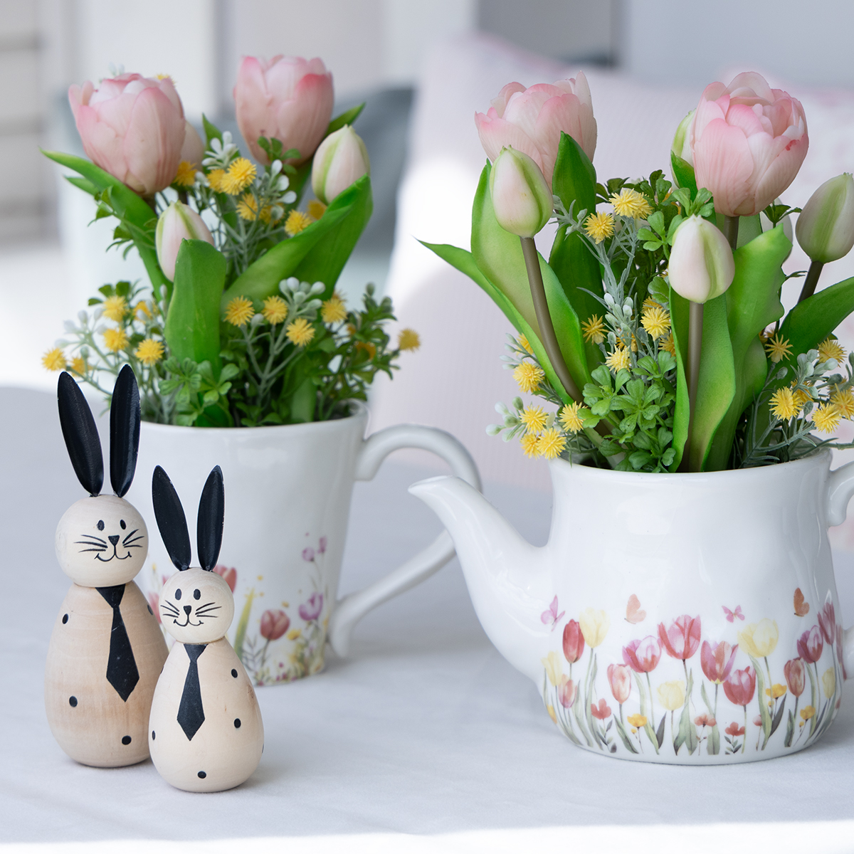 Quiconque apprécie le style champêtre moderne ou le minimalisme scandinave sera conquis par ces petits lapins en bois. Ils s'harmonisent à merveille avec d'autres matières naturelles comme le feutre, le coton ou la céramique et se marient avec presque toutes les palettes de couleurs, des pastels délicats aux teintes printanières éclatantes. Ils créent même un superbe effet visuel associés à des fleurs fraîches ou des plantes vertes. À essayer absolument : ils sont tout simplement magnifiques en décoration de table dans la salle à manger ou apportent une touche charmante à votre petit-déjeuner de Pâques !