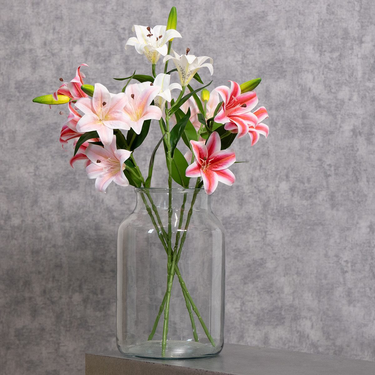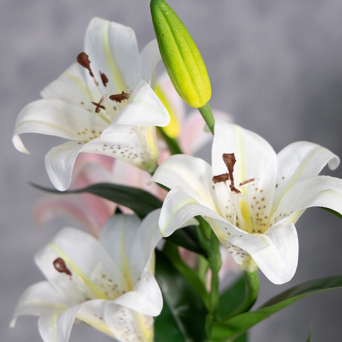 Que ce soit pour une décoration de salon élégante, un bureau chic ou une somptueuse composition florale de mariage, ces lys sont de véritables atouts. Ceux qui privilégient un style simple et élégant peuvent les associer à des accessoires blancs ou crème ; pour un contraste saisissant, des couleurs vives comme le vert foncé, le bordeaux ou l’or sont recommandées. Laissez libre cours à votre créativité et faites de ces élégants lys la pièce maîtresse de votre décoration !