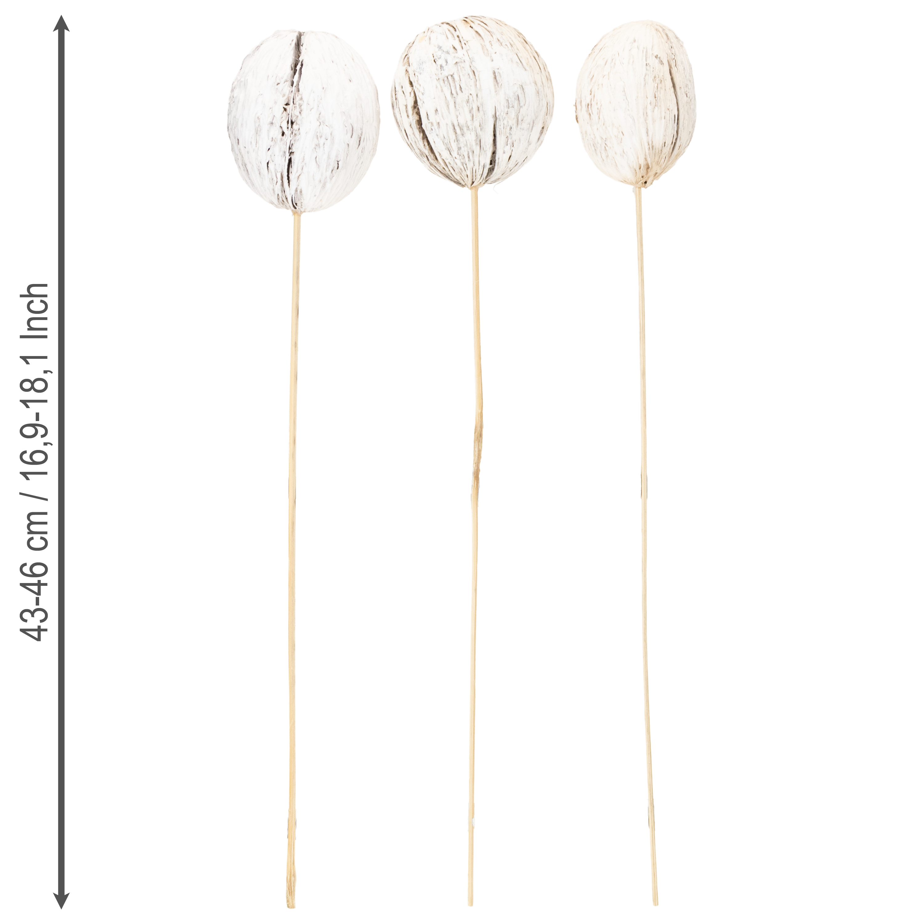 Nos boules de mintolla blanchies sont disponibles en lot de 6 pièces. Elles mesurent selon le cas entre 7 et 10 cm et avec leur tige, leur longueur totale atteint de 43 à près de 46 centimètres.