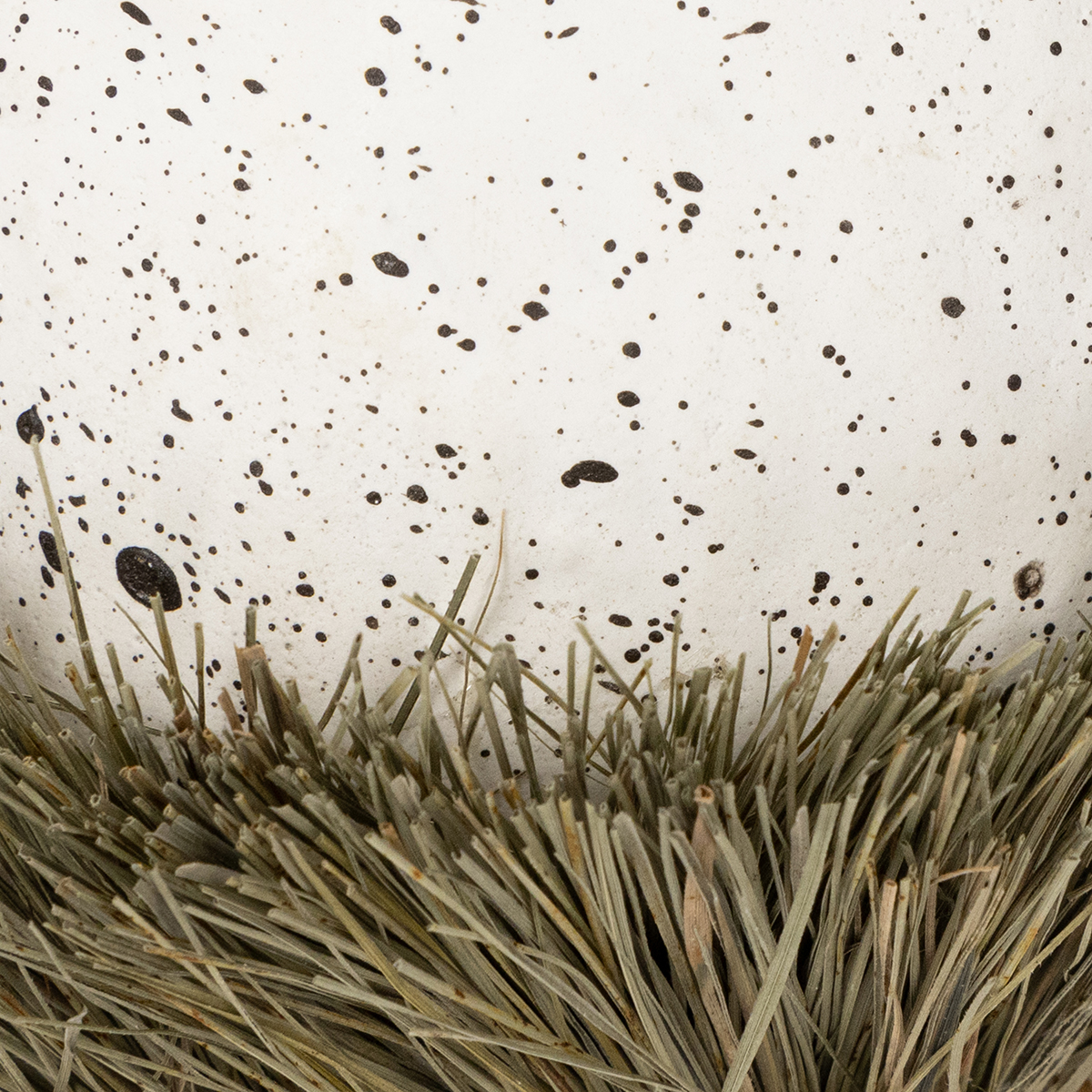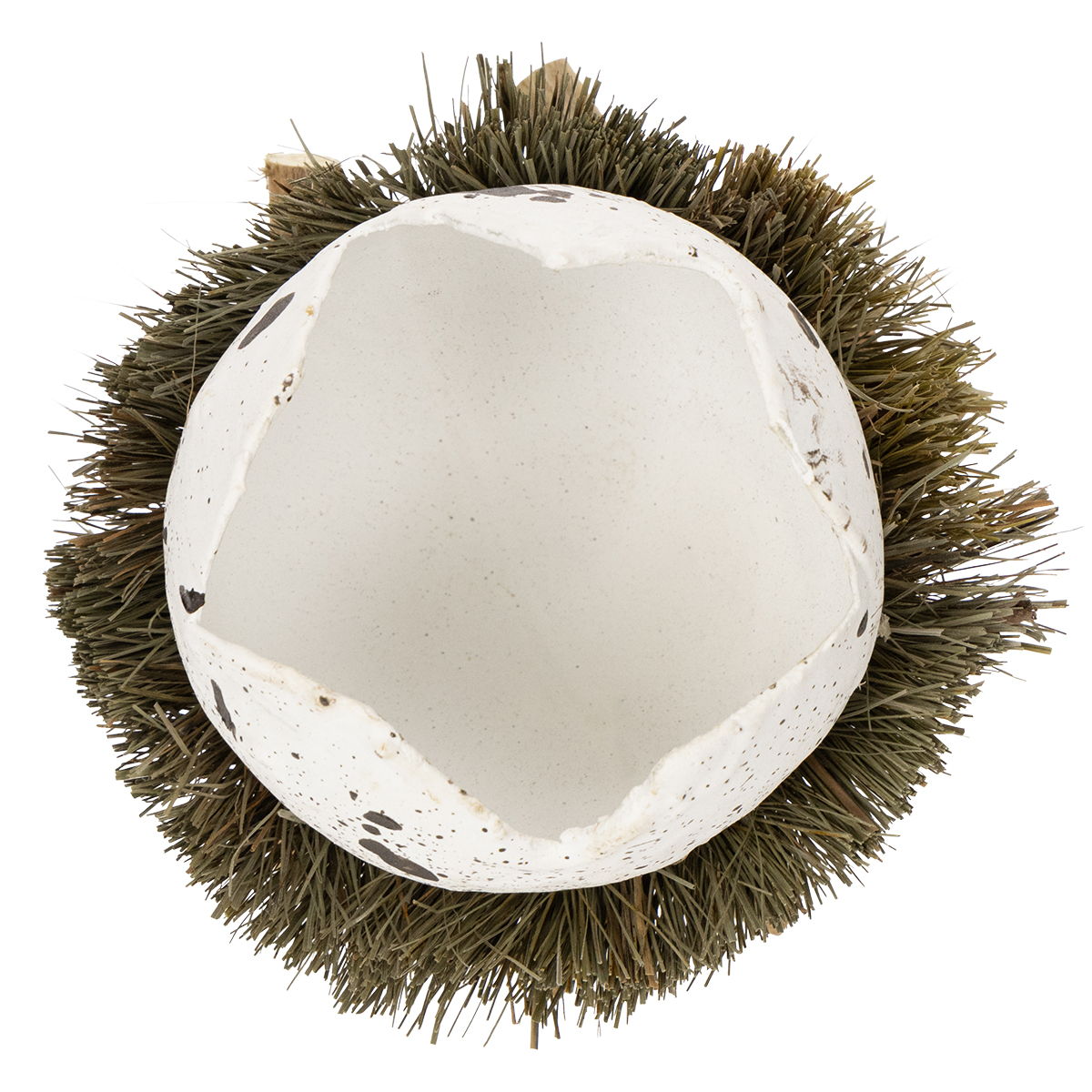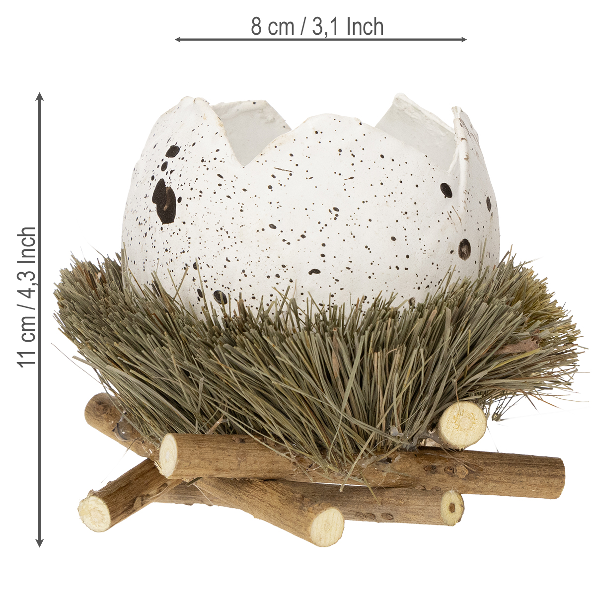 L'œuf blanc décoratif avec des taches brunes est placé dans un lit de véritable herbe séchée, qui est placé sur une couronne de petites bûches. - Ainsi, l'ensemble ressemble non seulement à un véritable nid d'oiseau que vous pourriez trouver dans la nature, mais est également sûr et stable.