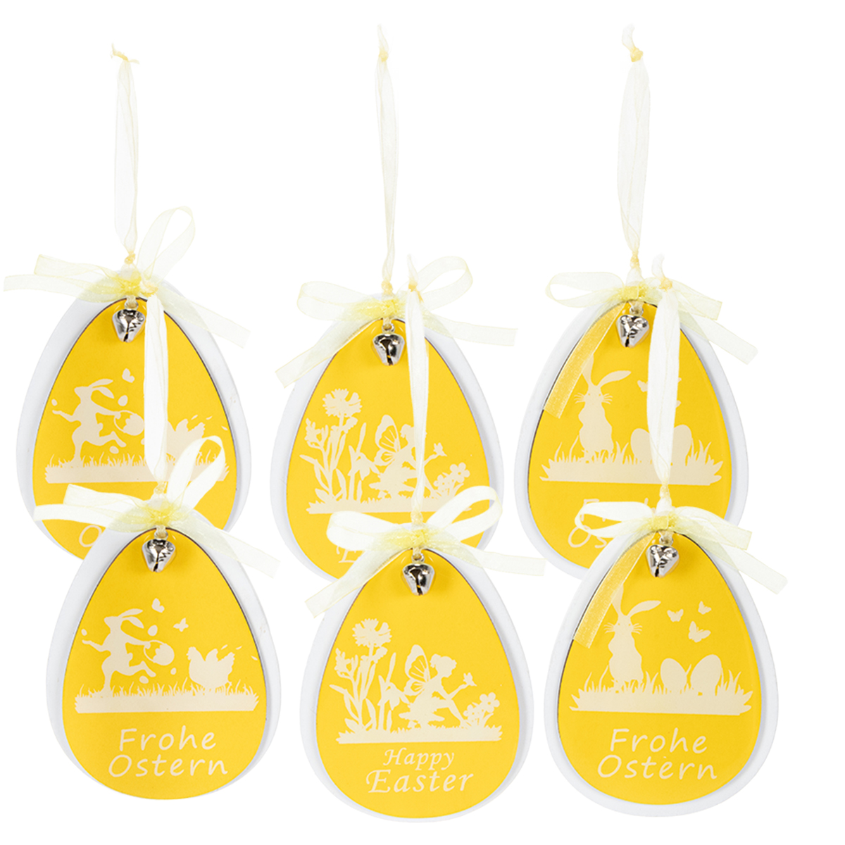 La décoration en bois se compose de la silhouette blanche d'un œuf de Pâques, qui est maintenu par le cintre avec un plus petit en jaune. Un paysage printanier est imprimé en blanc sur le pendentif jaune brillant et laqué, dans lequel un elfe s'agenouille pour laisser un papillon reposer sur sa main. Le souhait "Joyeuses Pâques" accompagne le motif nostalgique de Pâques. Une petite cloche en argent et un ruban translucide jaune citron complètent la décoration de Pâques atmosphérique de la marque de qualité VIANA.