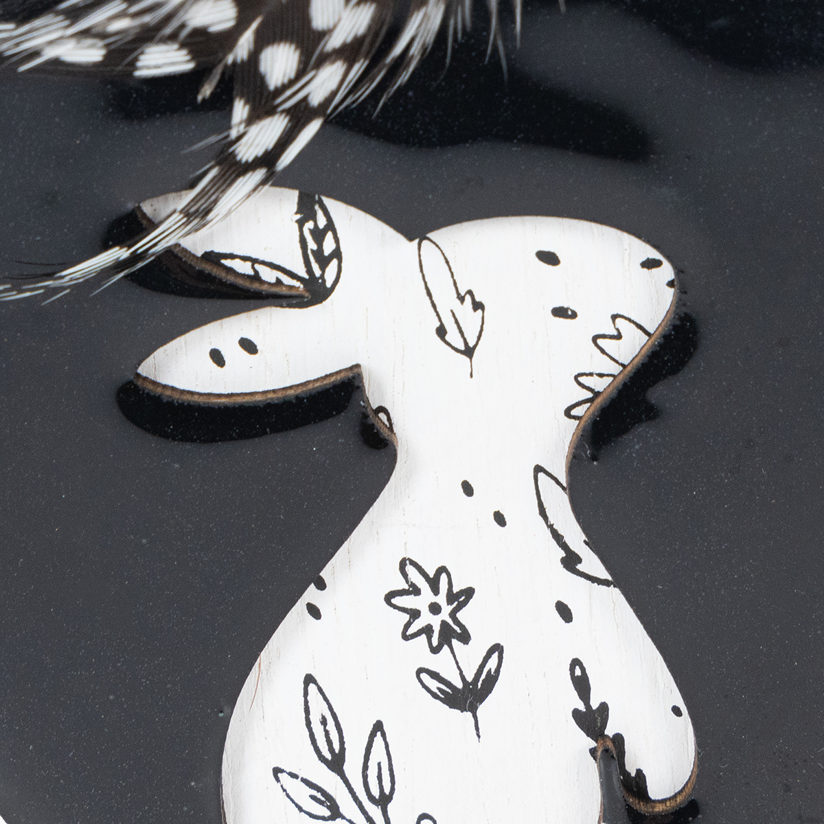Le cordon de couleur naturelle trône au-dessus de ces motifs paisibles tel un cintre, orné d'une plume de pintade et de trois petites perles en bois.
