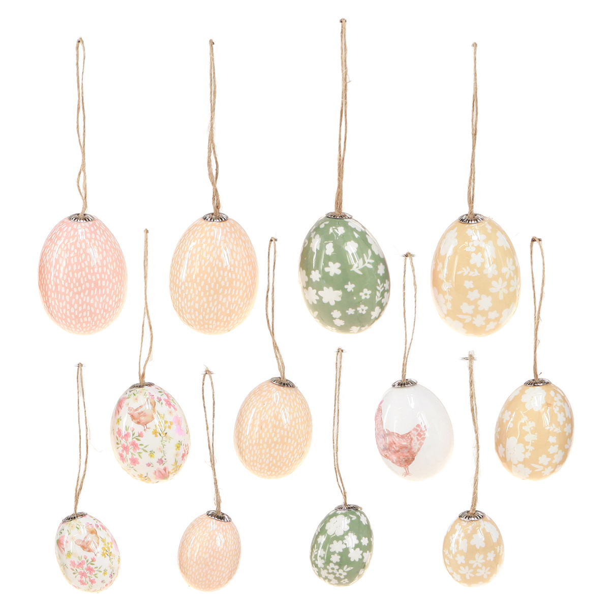 Nos œufs de Pâques en plastique aux couleurs fraîches blanc, vert et marron sont la décoration de Pâques parfaite pour votre maison. Ces œufs magiques en plastique sont non seulement accrocheurs visuellement, mais aussi extrêmement pratiques à utiliser. Chaque œuf est constitué d'une coque en plastique transparent et contient du papier coloré en vert et marron à l'intérieur. Le design est complété par des motifs de poulet occasionnels qui soulignent le charme rural. Les petits œillets métalliques et les boucles en jute permettent d'accrocher facilement les œufs, que ce soit sur le bouquet de Pâques dans le salon, sur la couronne de Pâques sur la porte ou sur le buisson de Pâques sur le balcon. Les deux sacs contiennent chacun 12 œufs en plastique de différentes tailles (3,5 à 5,5 cm), ce qui garantit un design varié et créatif. La combinaison de symboles classiques de Pâques et de matériaux modernes fait de cette décoration de Pâques une décoration de table colorée ou un joli design de balcon au printemps.