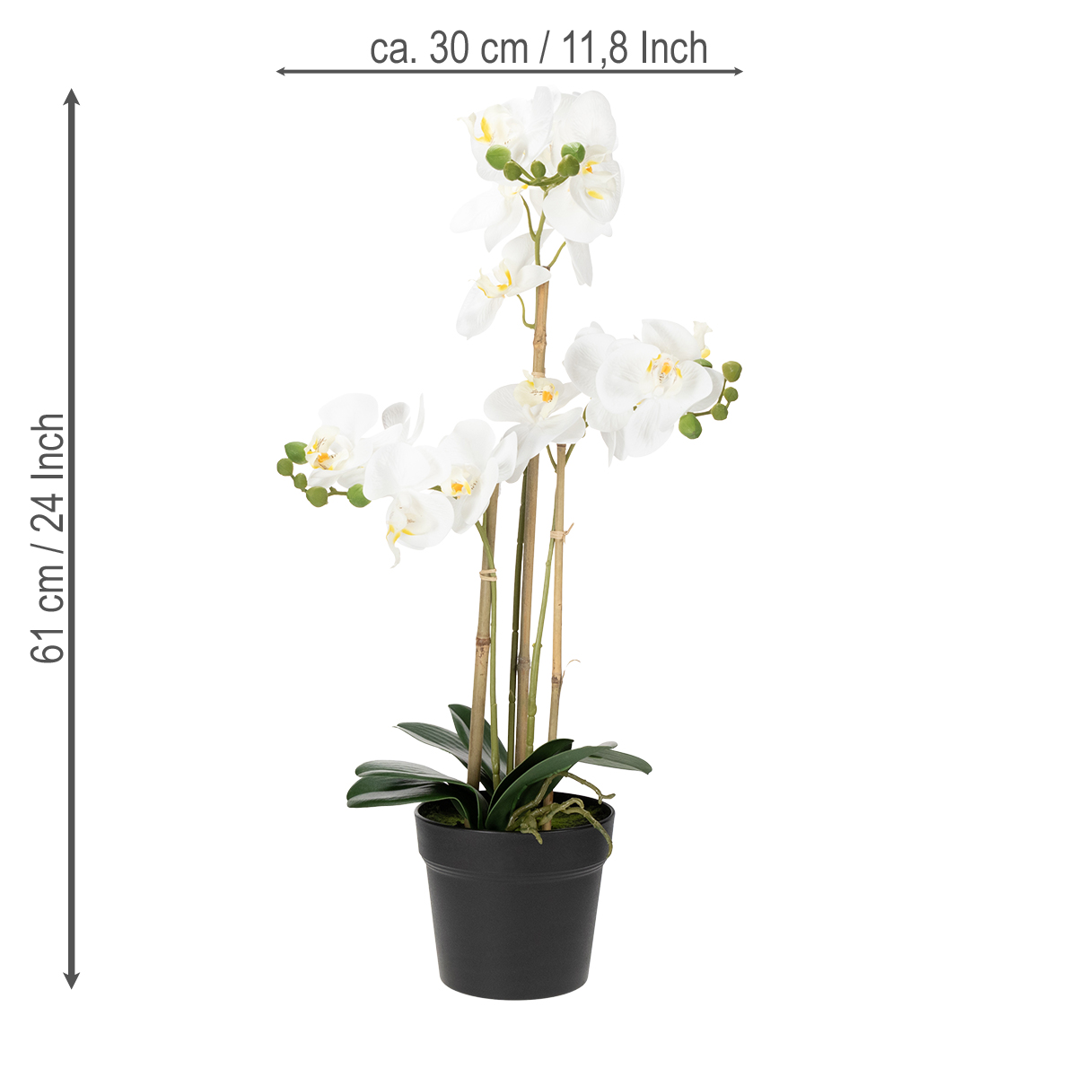 Notre orchidée artificielle de haute qualité apporte une touche d'élégance à votre intérieur. Composée de trois tiges blanches ornées de petits boutons verts, elle repose en toute sécurité dans un pot noir discret qui s'intègre harmonieusement à tous les styles de décoration. Fabriquée avec soin à partir de tissu et de plastique, cette fleur artificielle allie un aspect réaliste à une grande durabilité. D'une largeur et d'un diamètre d'environ 25 cm, elle trouvera parfaitement sa place dans un salon, un bureau ou un espace d'accueil raffiné.