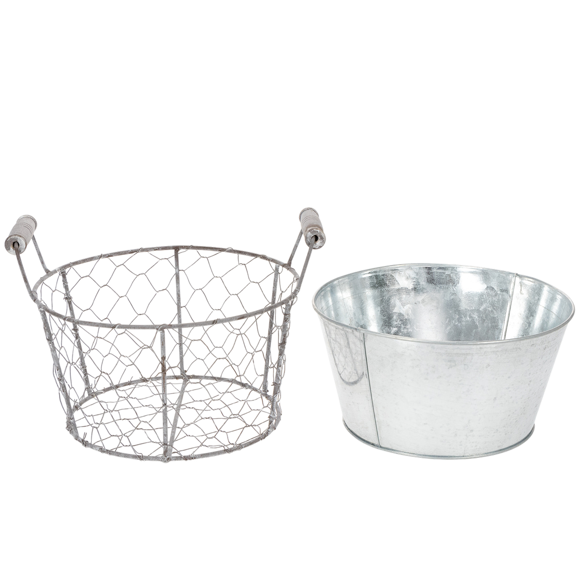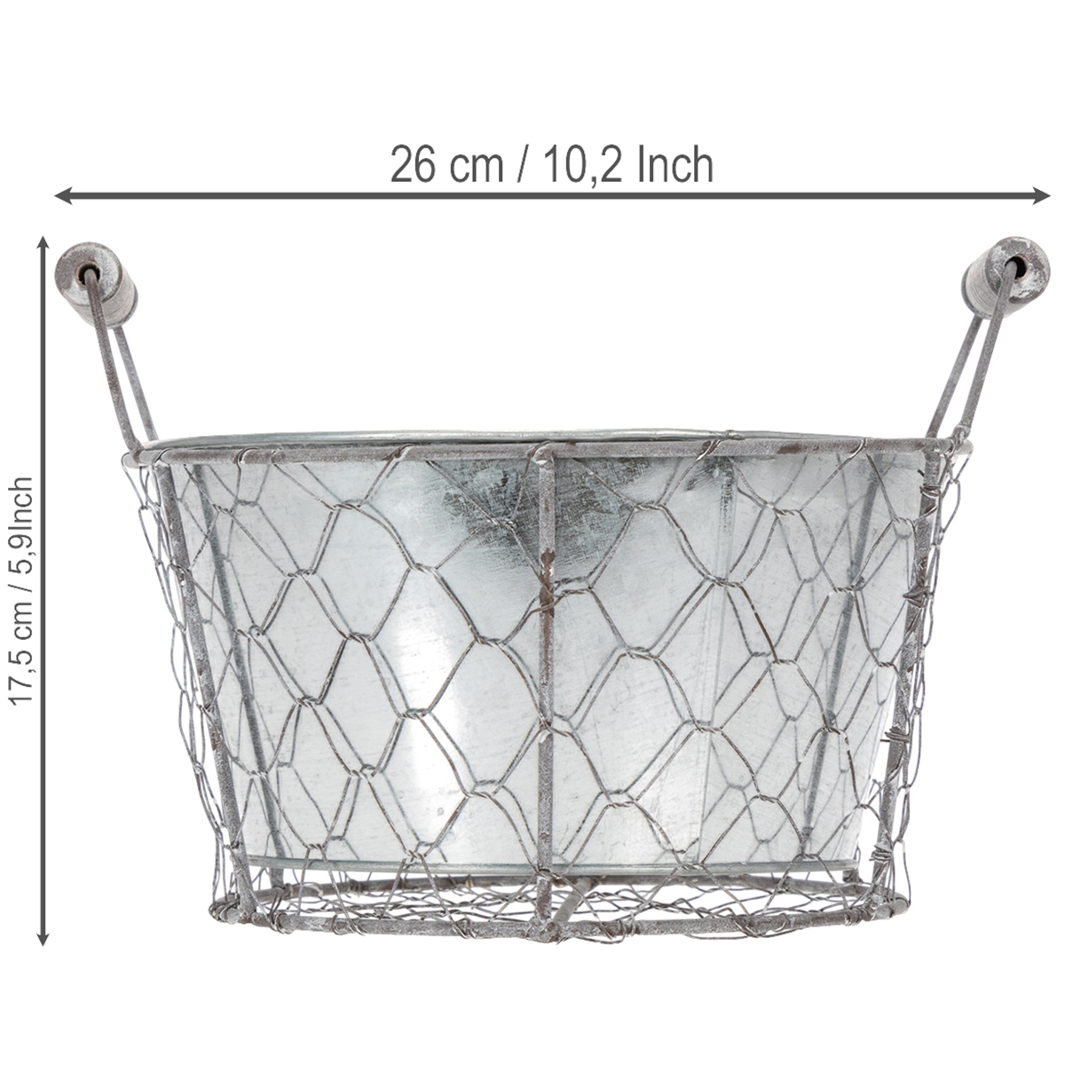 Panier à plantes avec insert, panier en fil de fer, jardinière, argenté printanier, blanchi, style shabby chic, Ø 22 cm H 17,5 cm